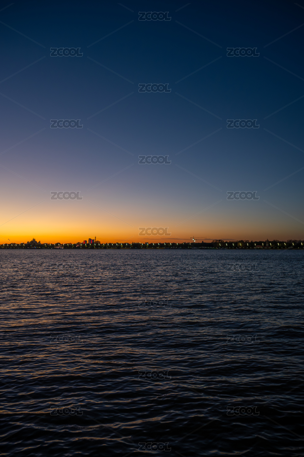 黑龙江哈尔滨黄昏时分的松花江与城市天际线