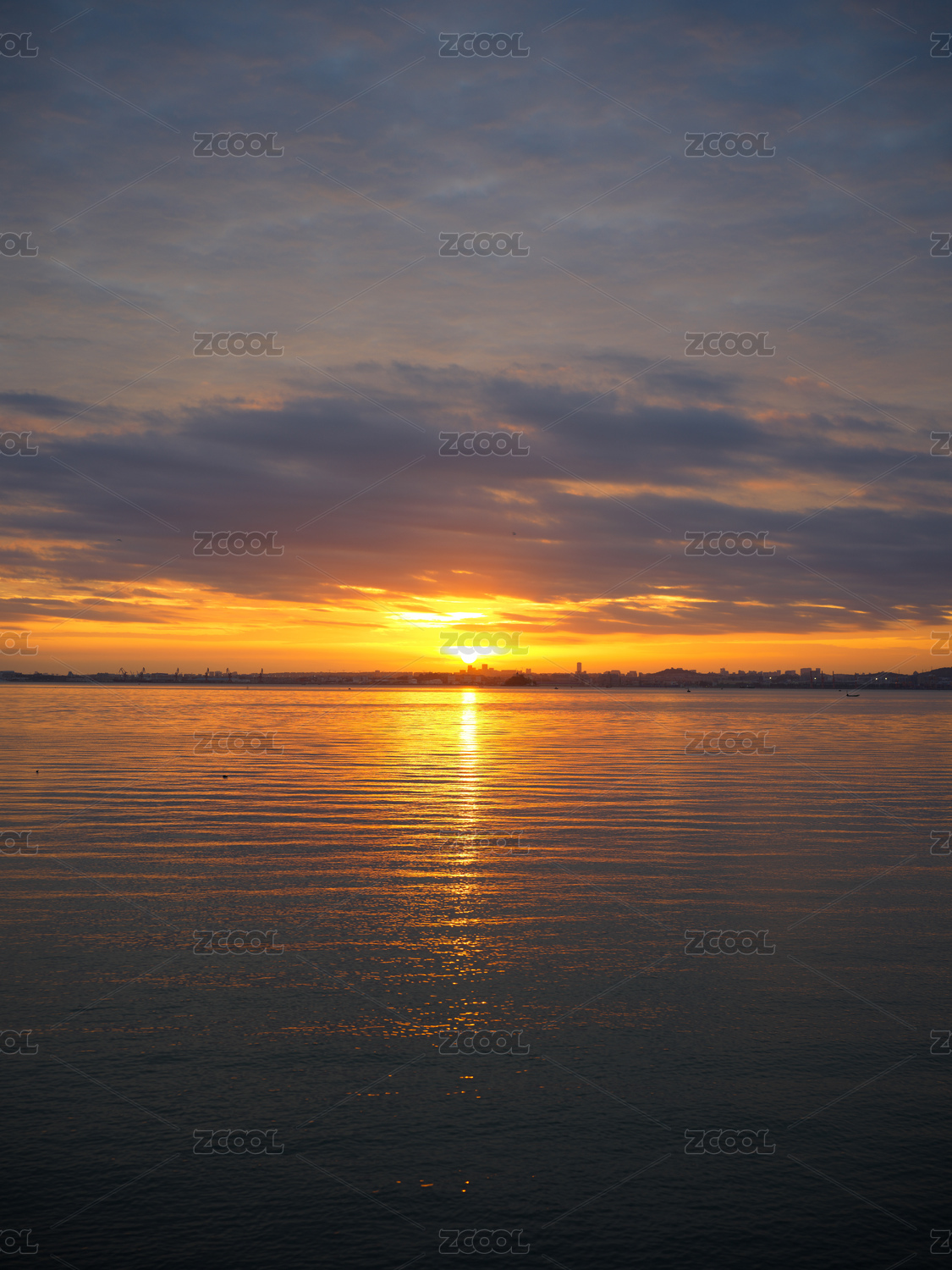 厦门马銮湾海岸日出时分的海面与城市天际线