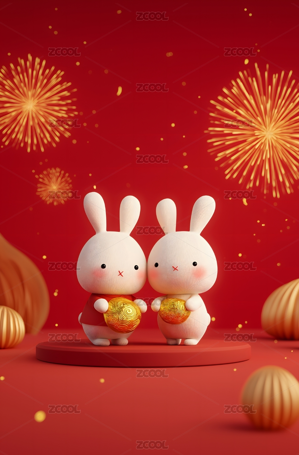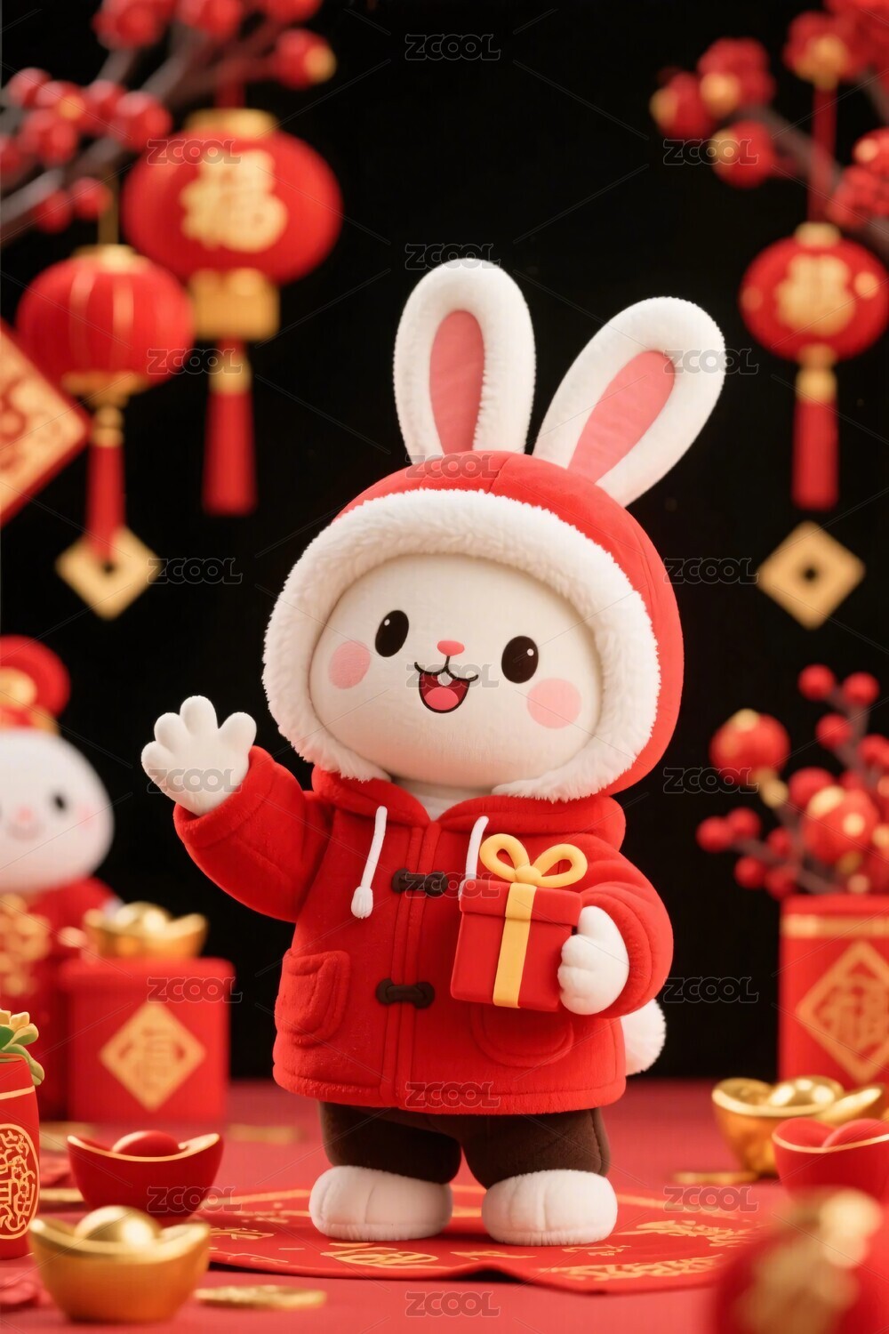 新春,兔子,卡通,插画,节日,红包,灯笼,孩童,桂花,红色