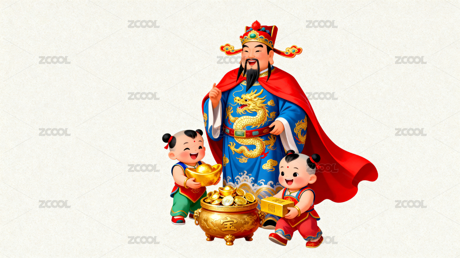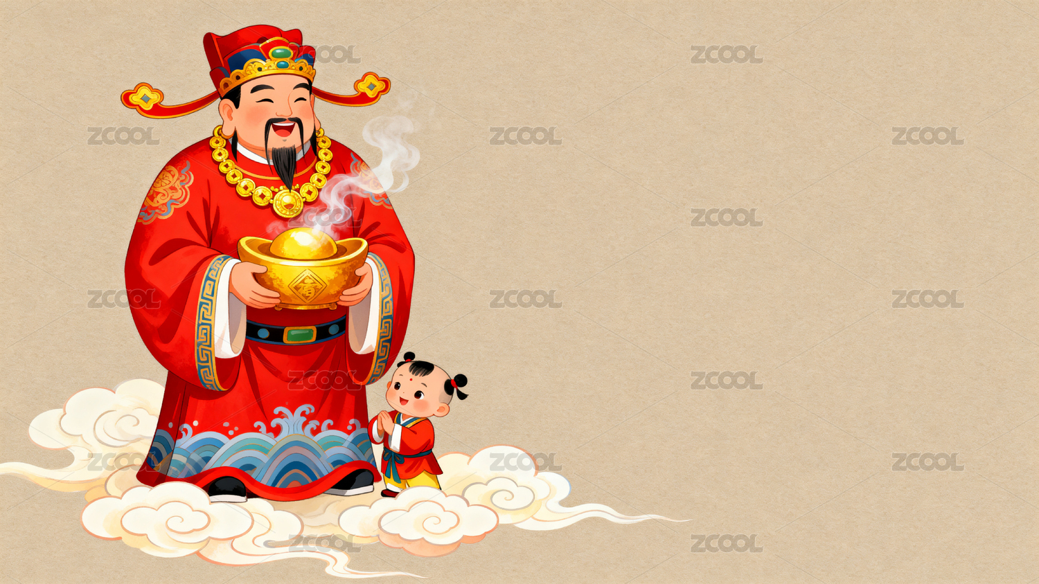 传统,装饰,喜庆,金色,财神,金元宝,云朵,笑容,服饰,图案