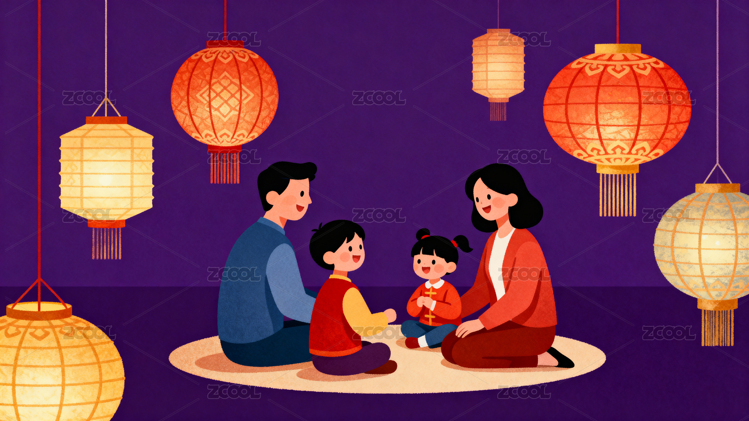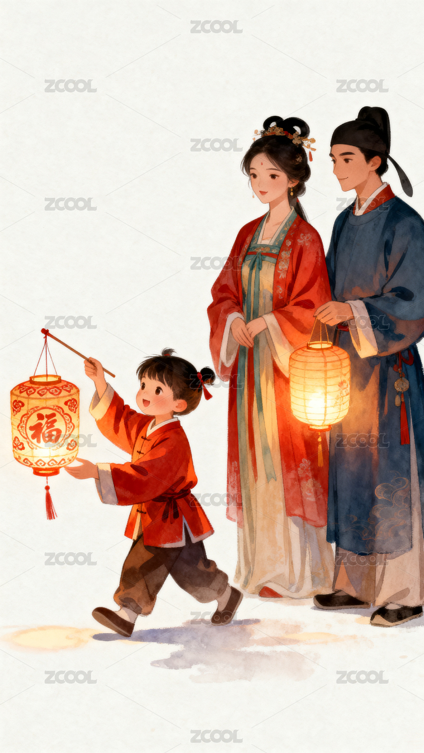 古风灯笼下的温馨家庭