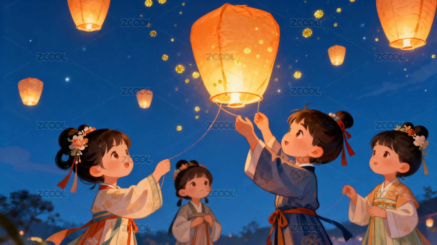 古装人物手持灯笼欢聚场景