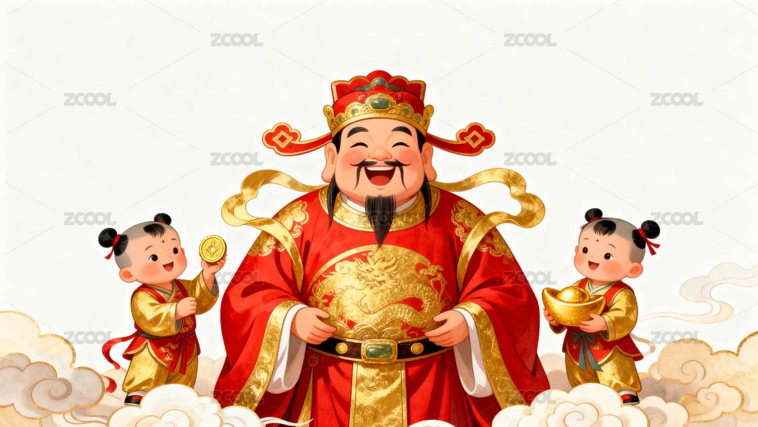节日,传统,装饰,喜庆,色彩,财神,金币,笑容,服饰,祝福