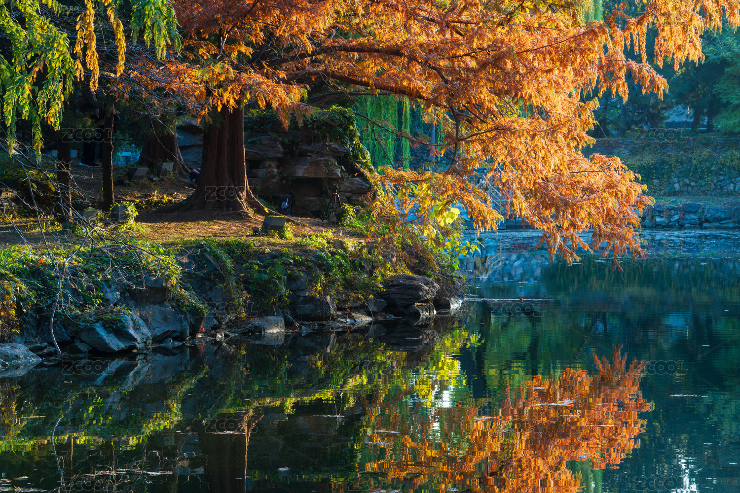 秋日水畔斑斓落羽杉