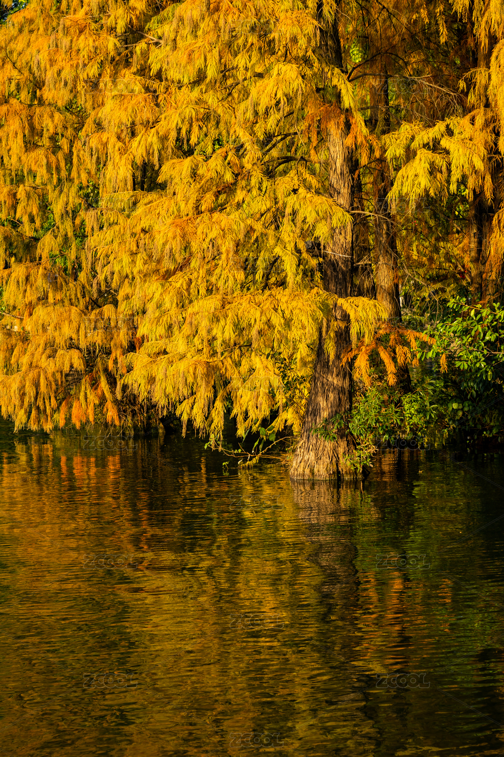 秋天湖里的水杉树斑斓的叶子与倒影