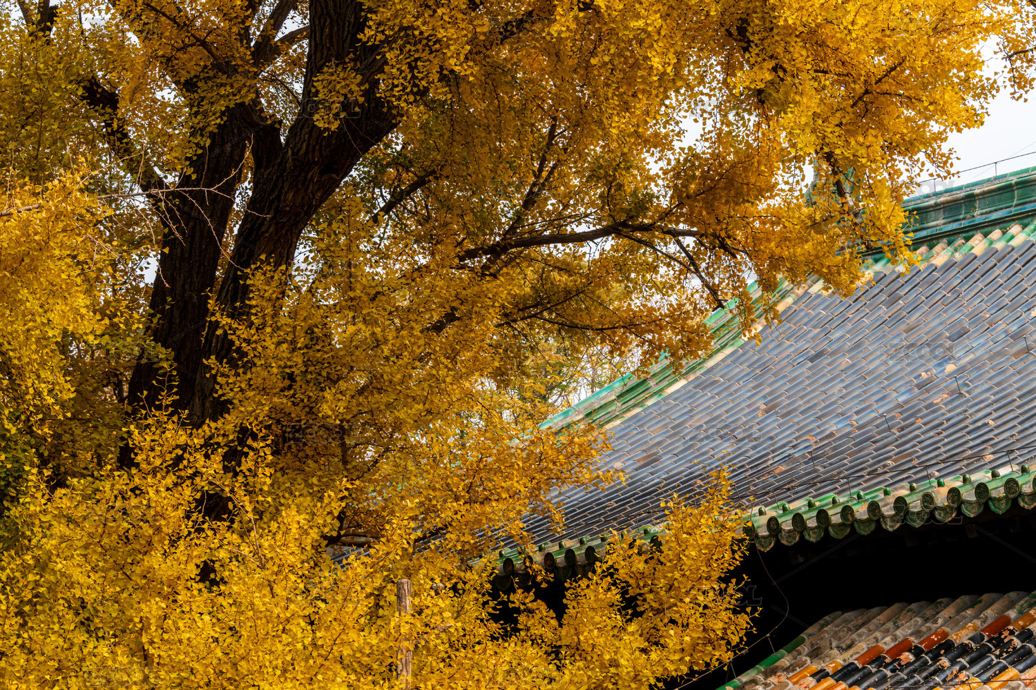 秋天中国北京大觉寺的金黄色银杏叶
