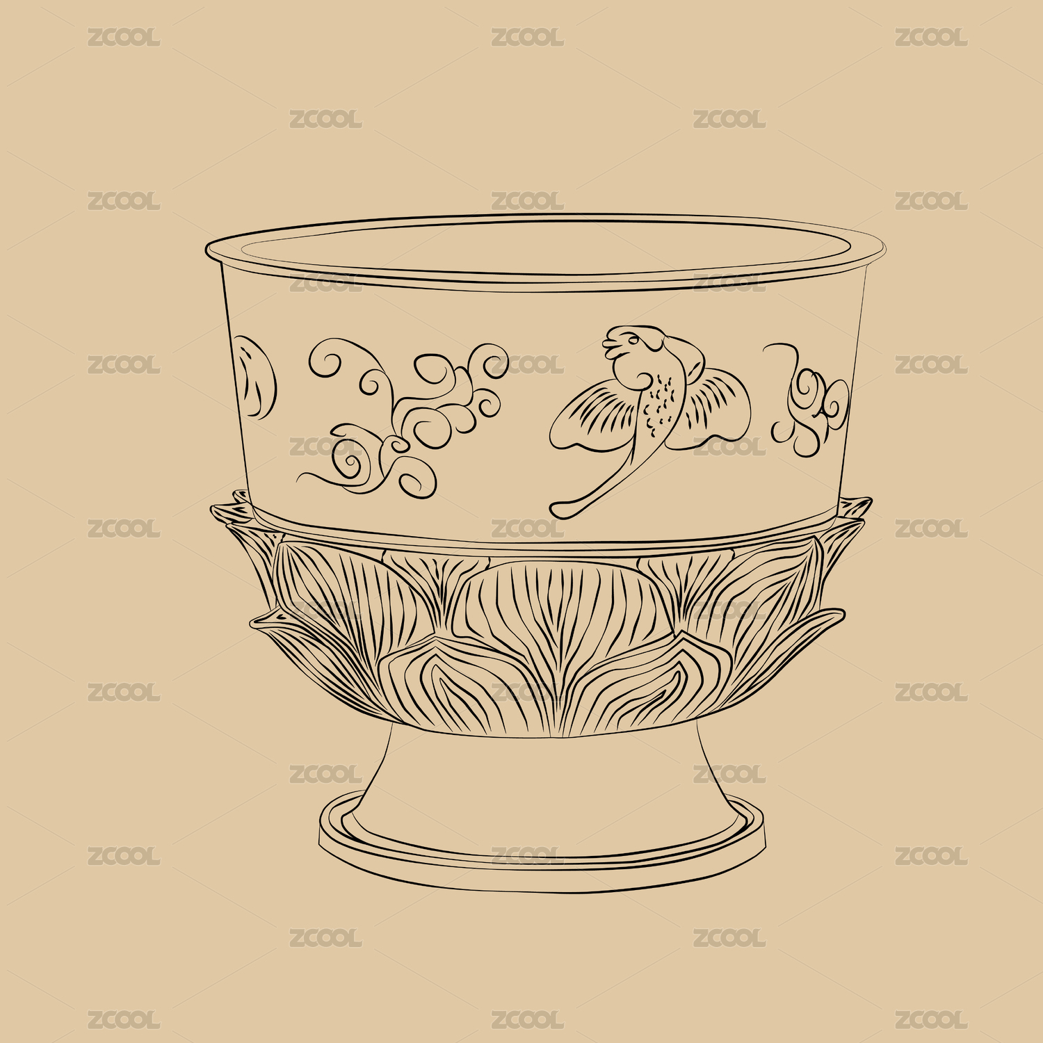 古风宋代青瓷莲花炉盏托手绘矢量线稿