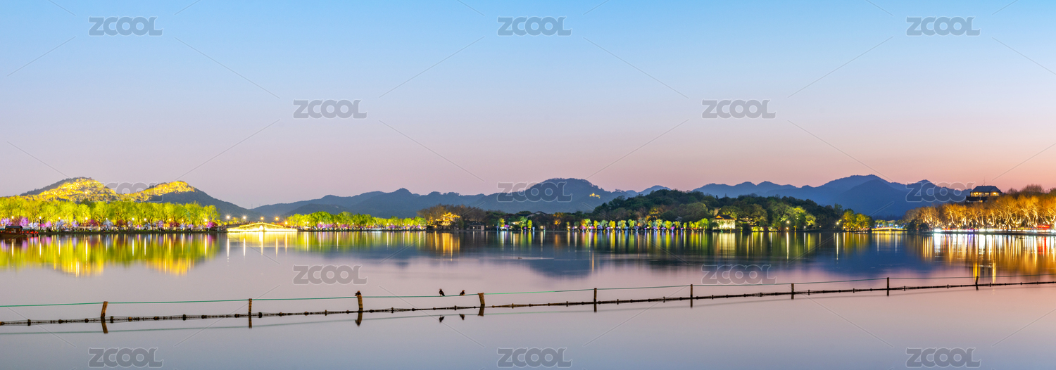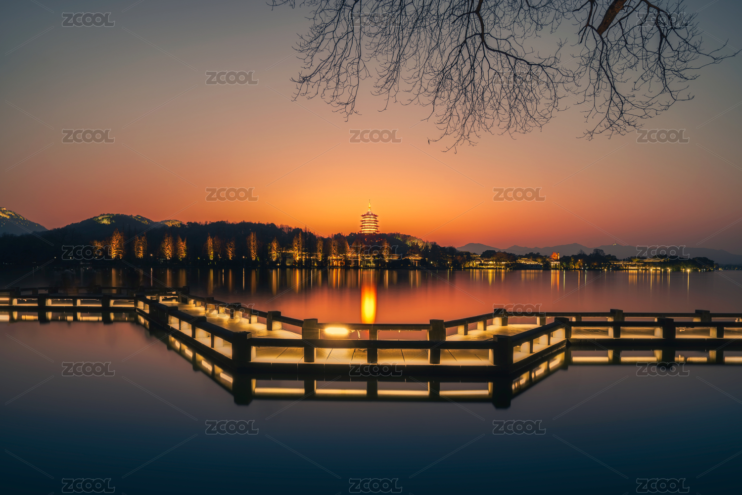 中国浙江杭州西湖景区,黄昏中的西湖秋天