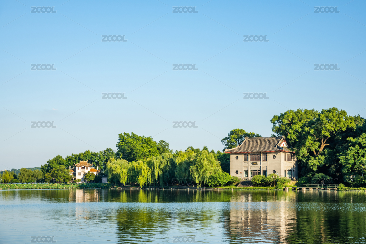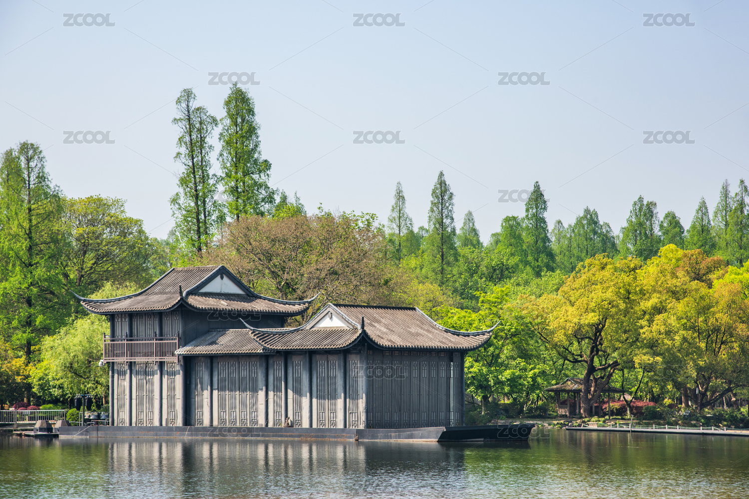 中国杭州西湖花港观鱼碧空映衬下的湖景
