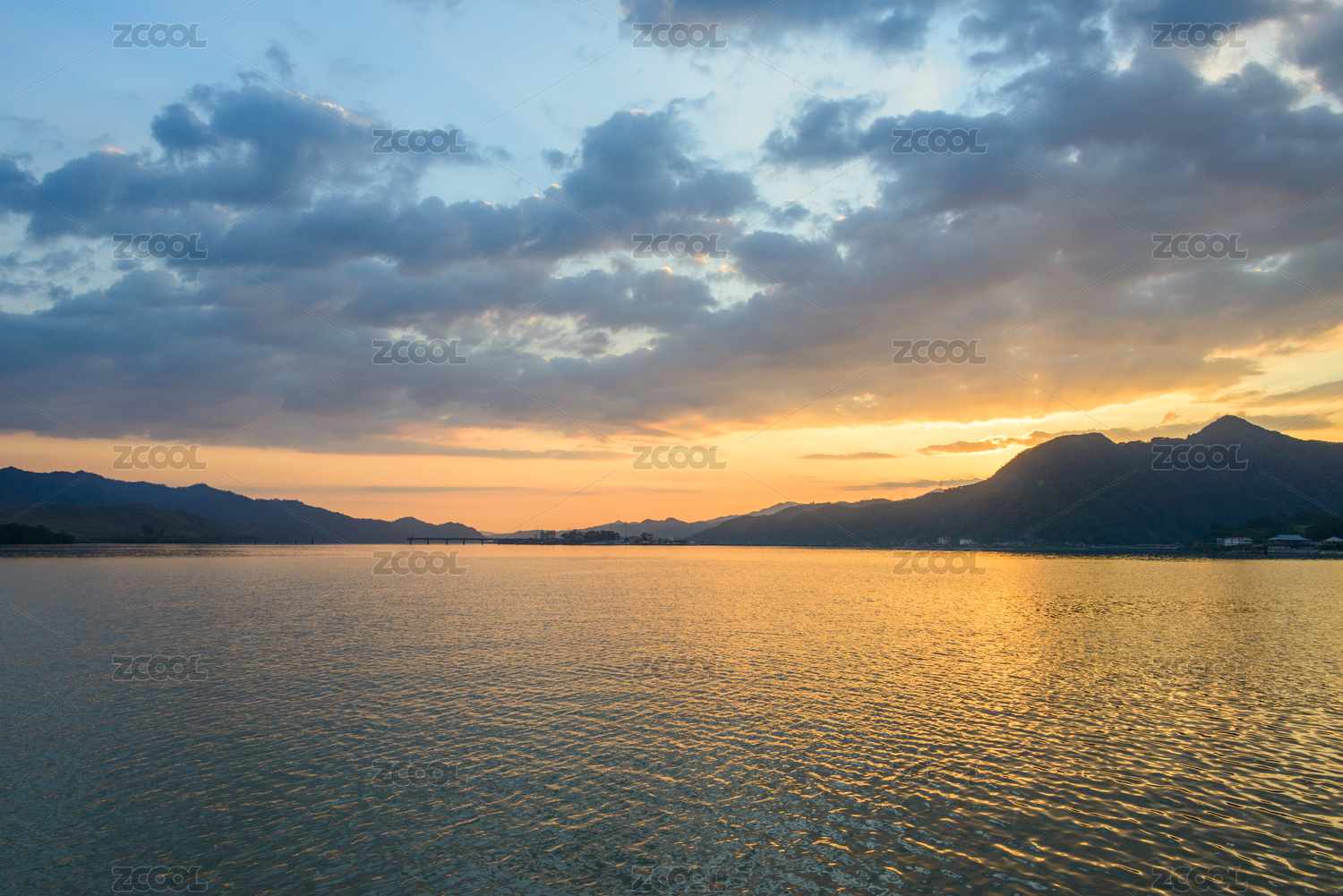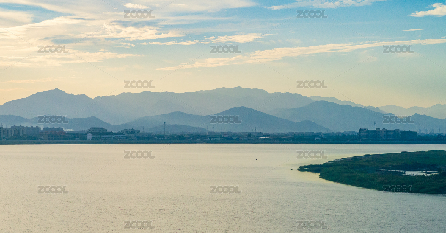 夕阳西下的湖面和远山