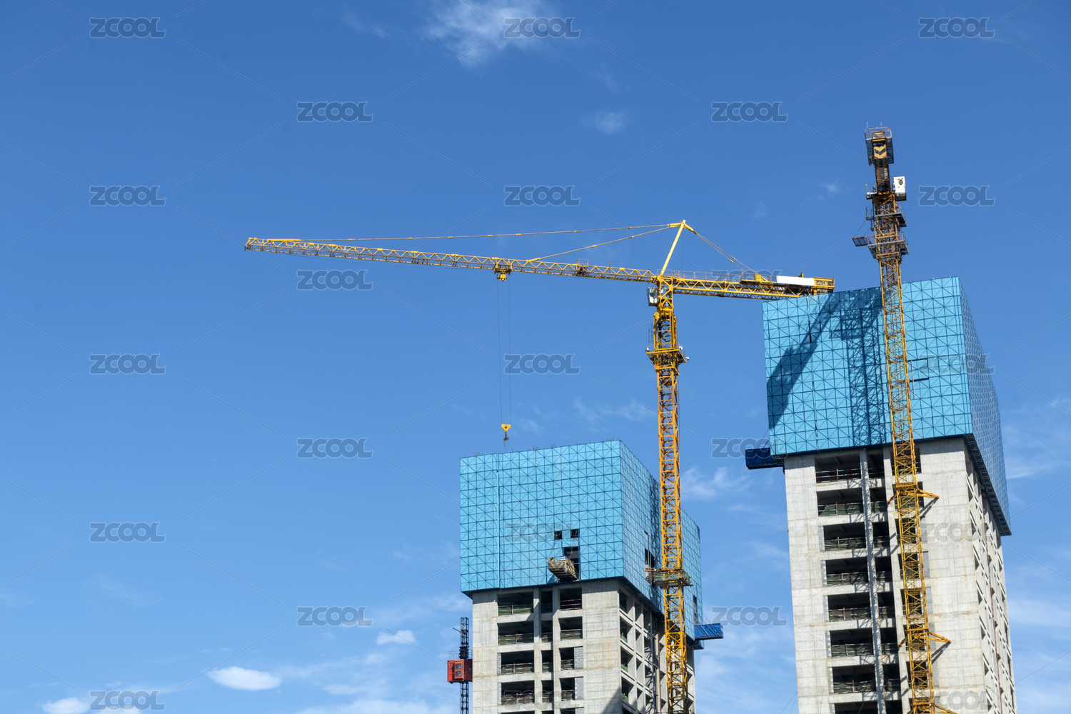 蓝天背景下高大的塔吊矗立在工地上