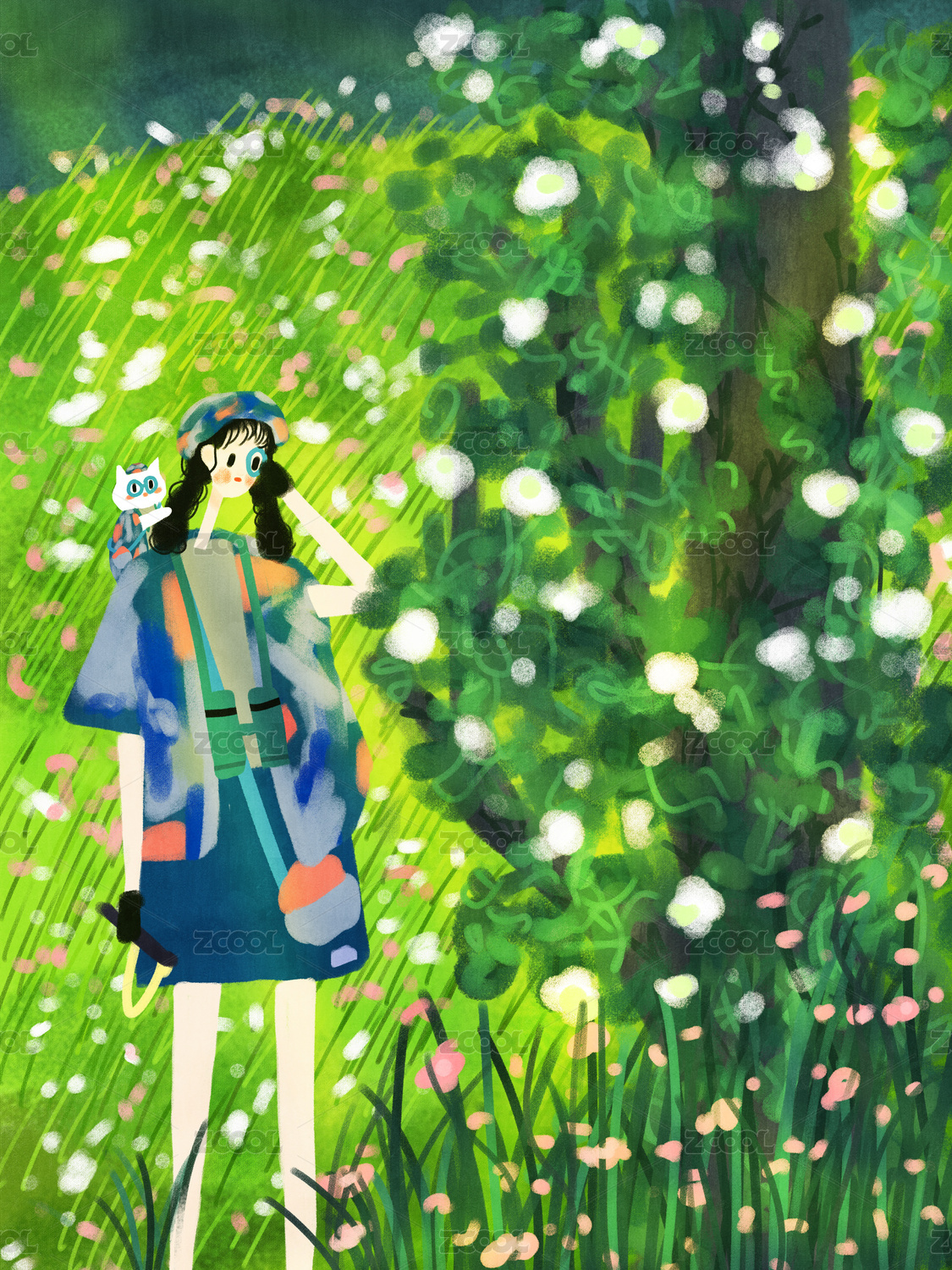 春季花海与女孩插画