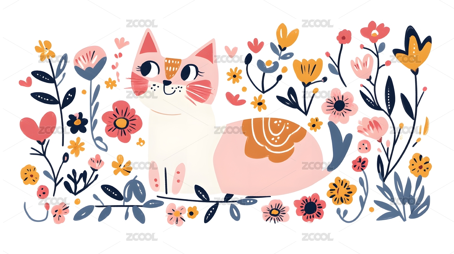 花卉元素的可爱装饰粉色猫插画