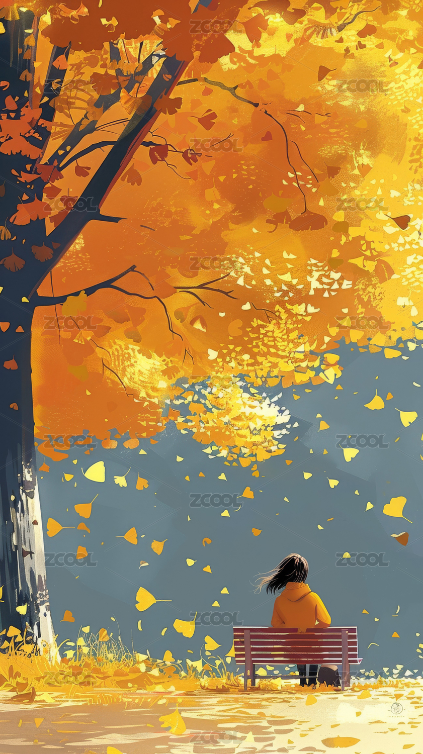 在金黄色的秋日一起看秋叶飘落-治愈插画