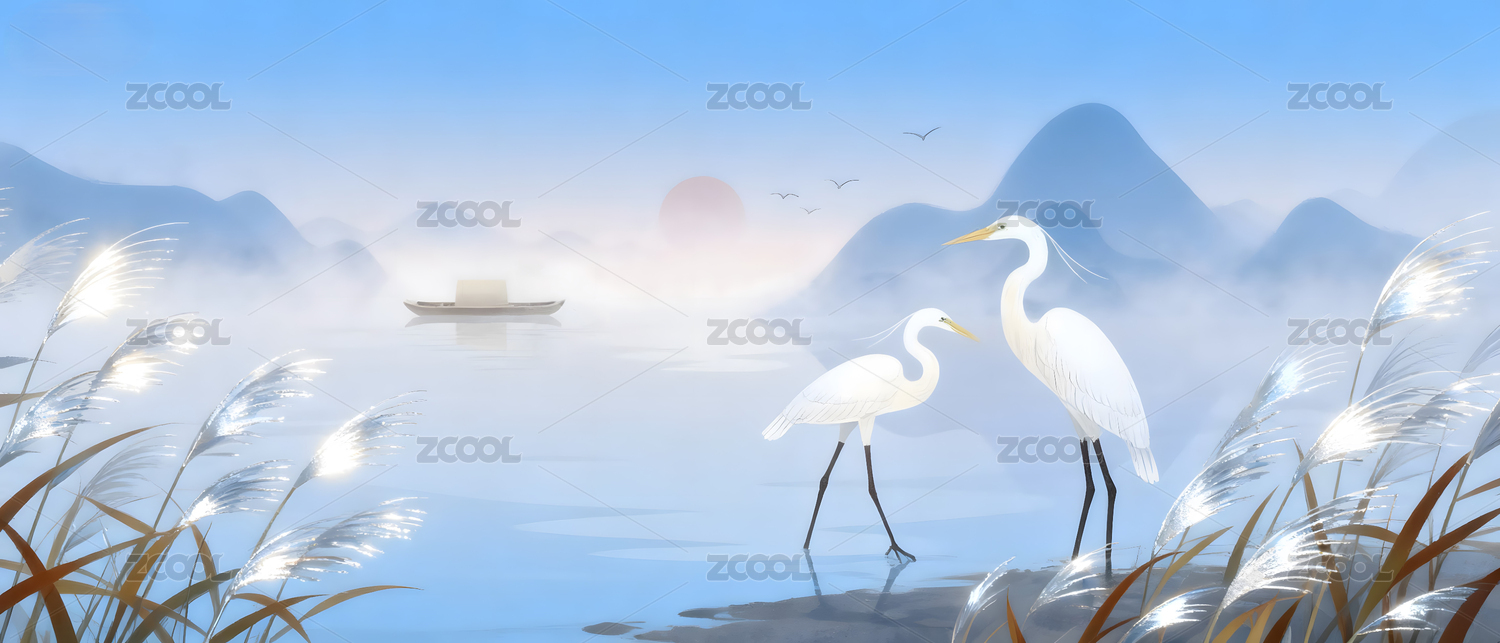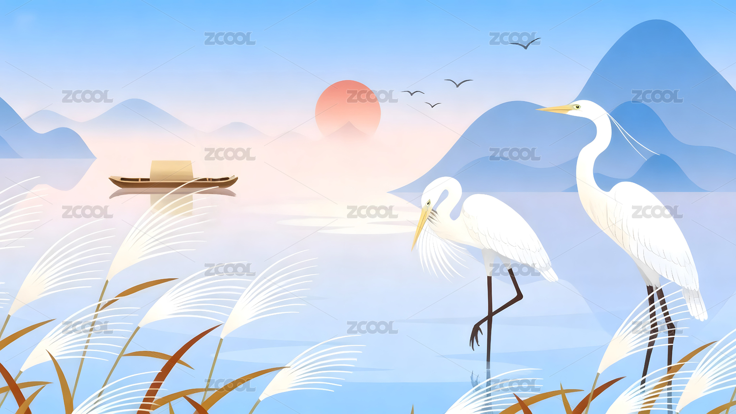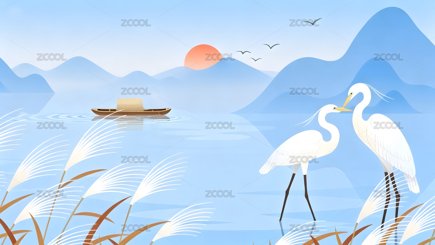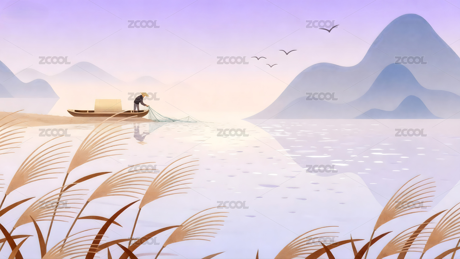 国潮中国风湖面上渔夫远山山水水墨风景插画