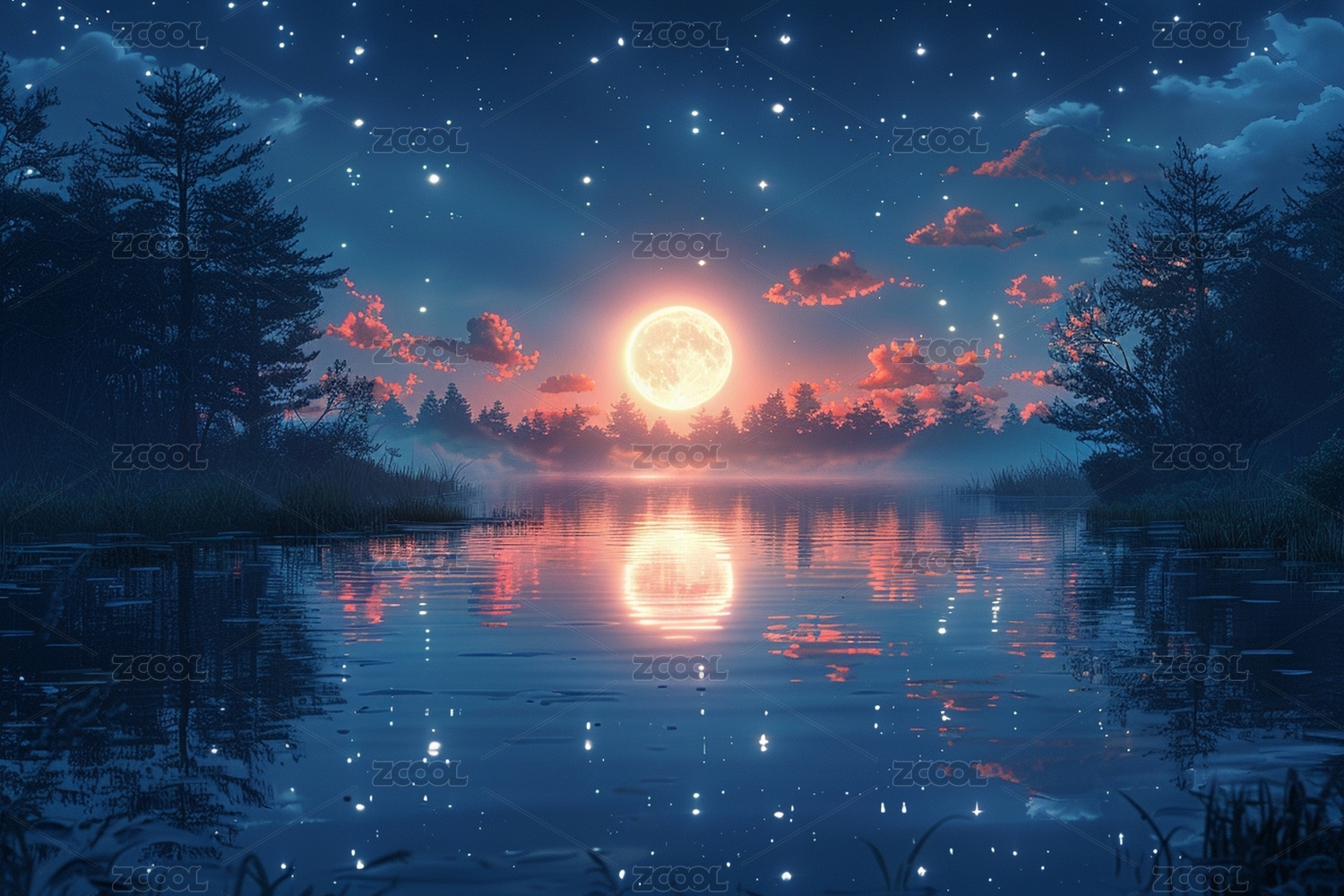 粉色月亮下的宁静湖面星空