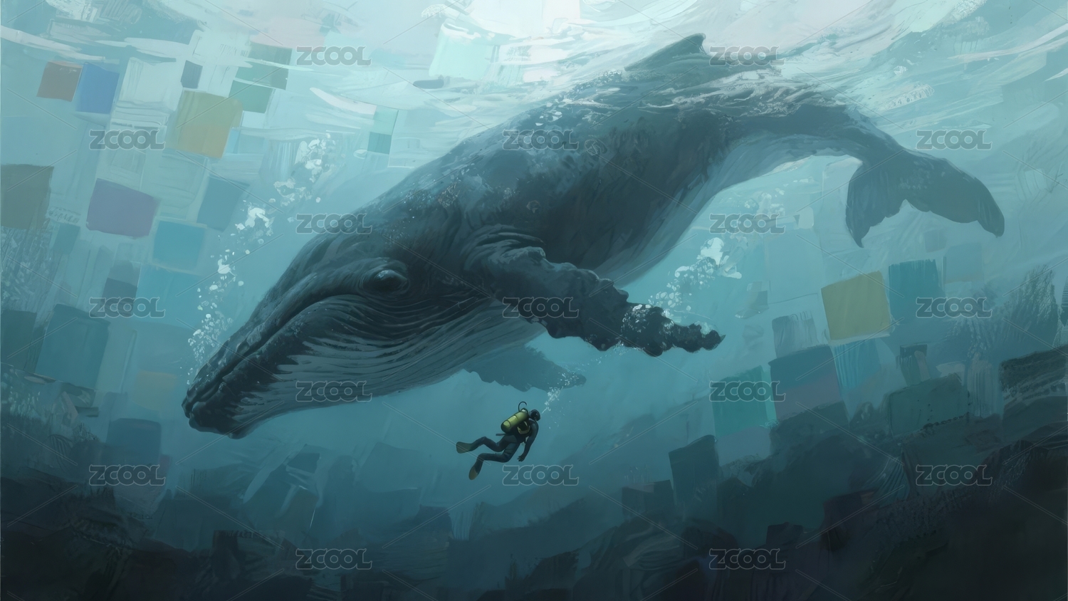 潜水员与巨鲸在数字海洋中相遇的奇幻场景