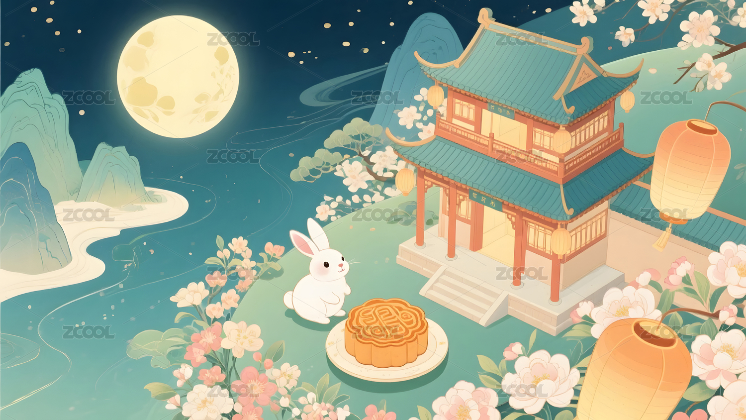 插画,中秋,佳节,卡通风格,中国风,玉兔,兔子,拟人,月饼,月宫
