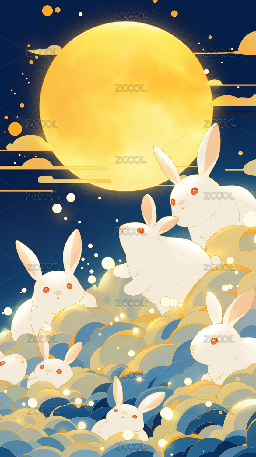 中秋节海报插画几只兔子玉兔在月下玩耍庆祝