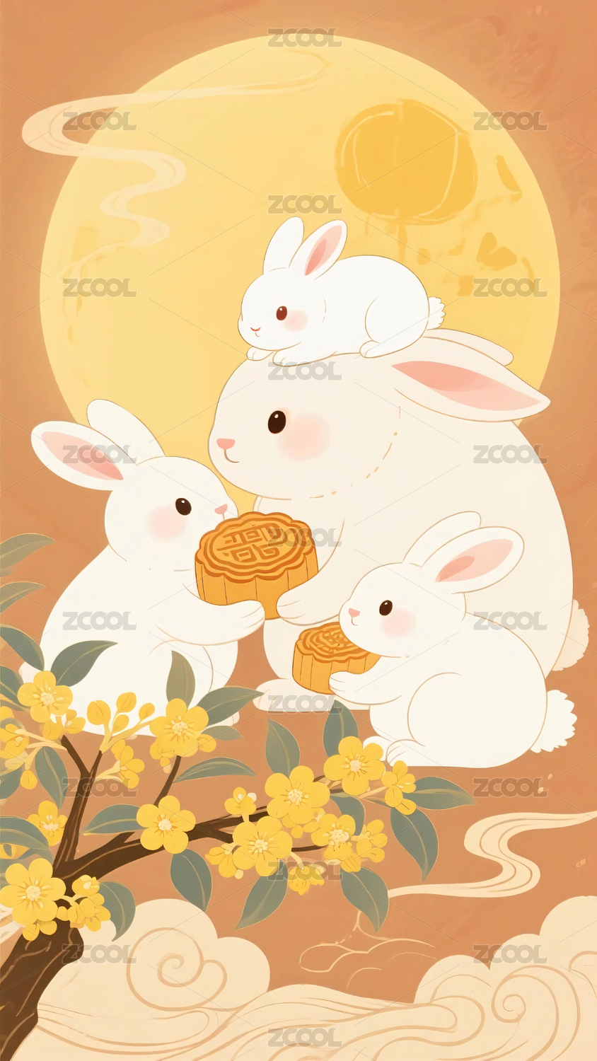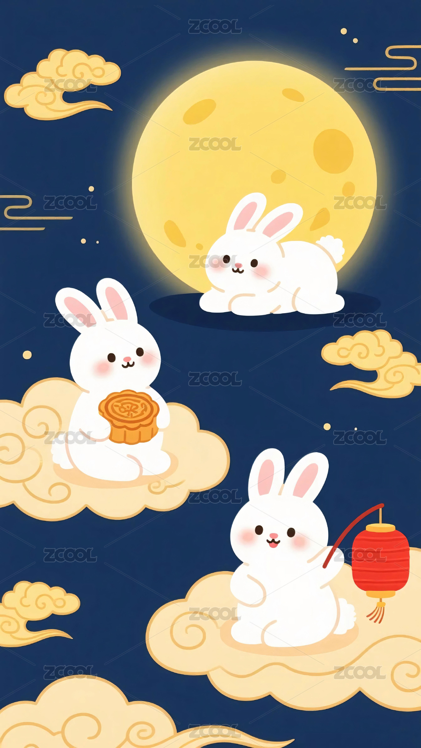 插画,中秋,佳节,卡通风格,中国风,玉兔,兔子,满月,祥云,传统
