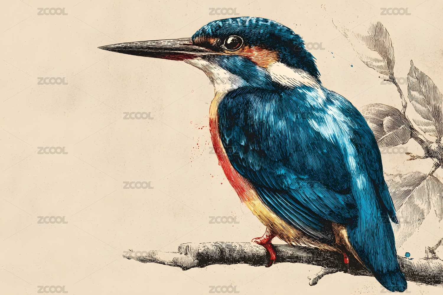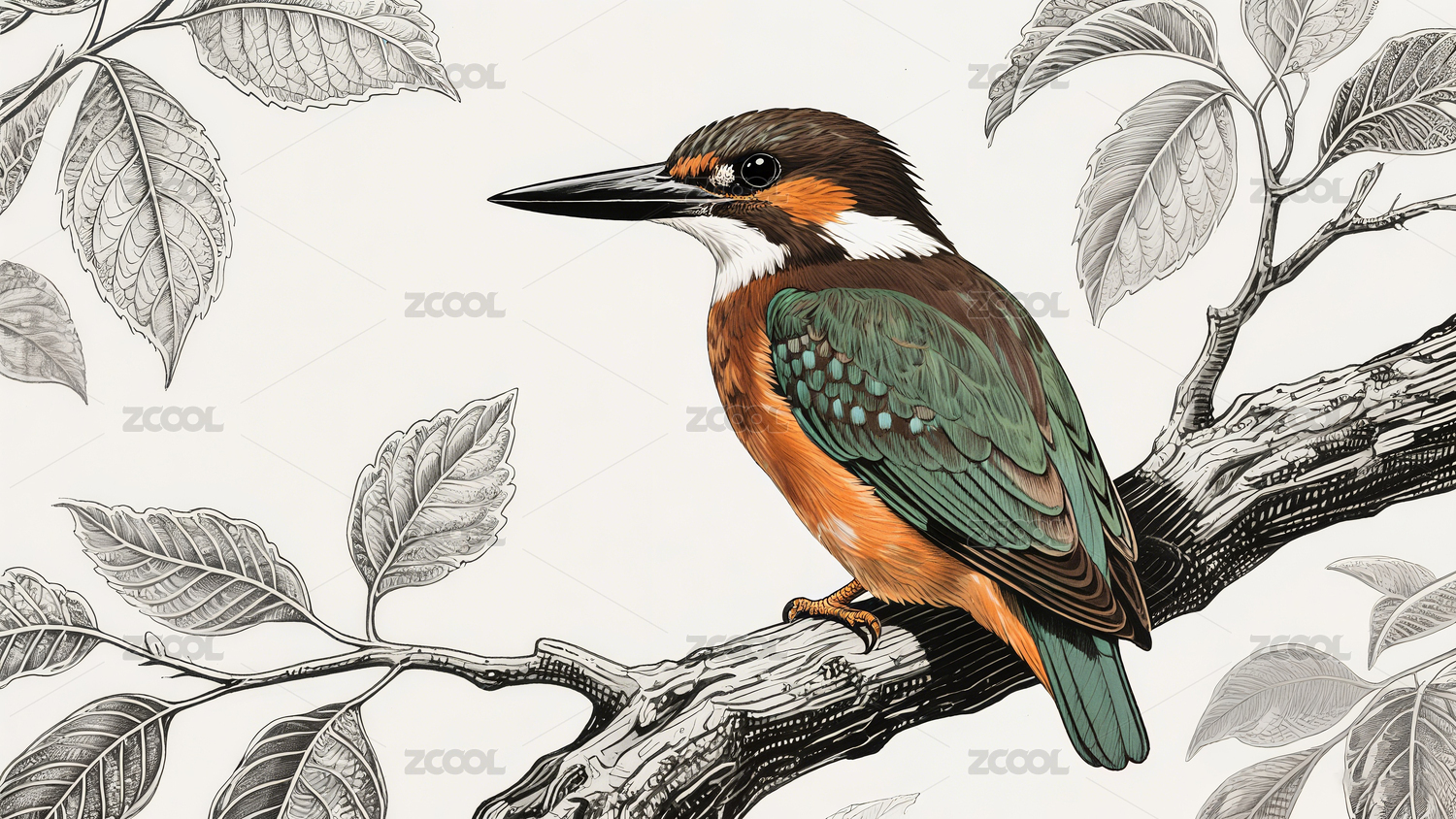 艺术,插画,光影,风格,精致,格式,鲜艳,翠鸟,枝头,静止