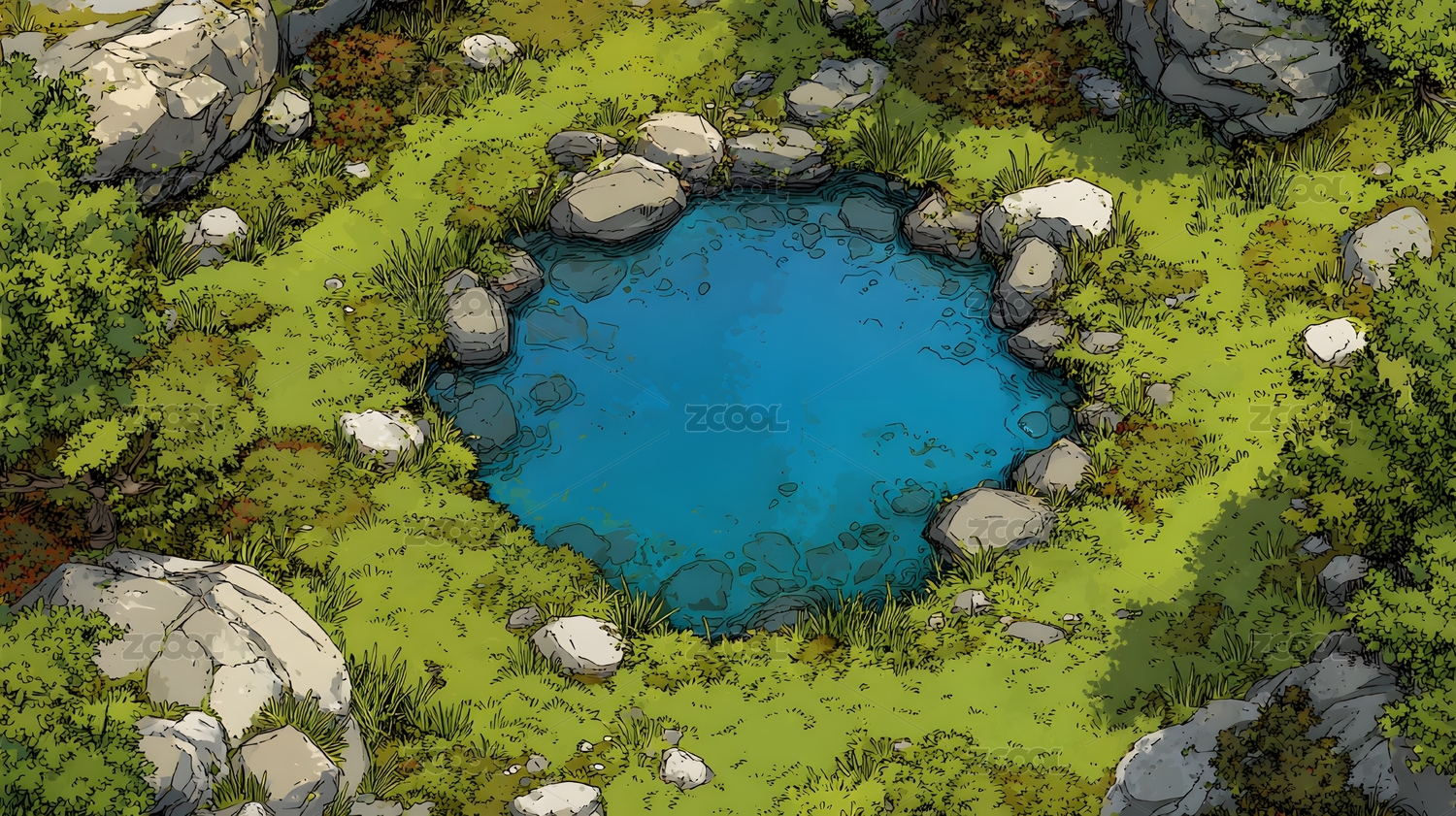 池塘鸟瞰图青色水面绿草环绕生机勃勃