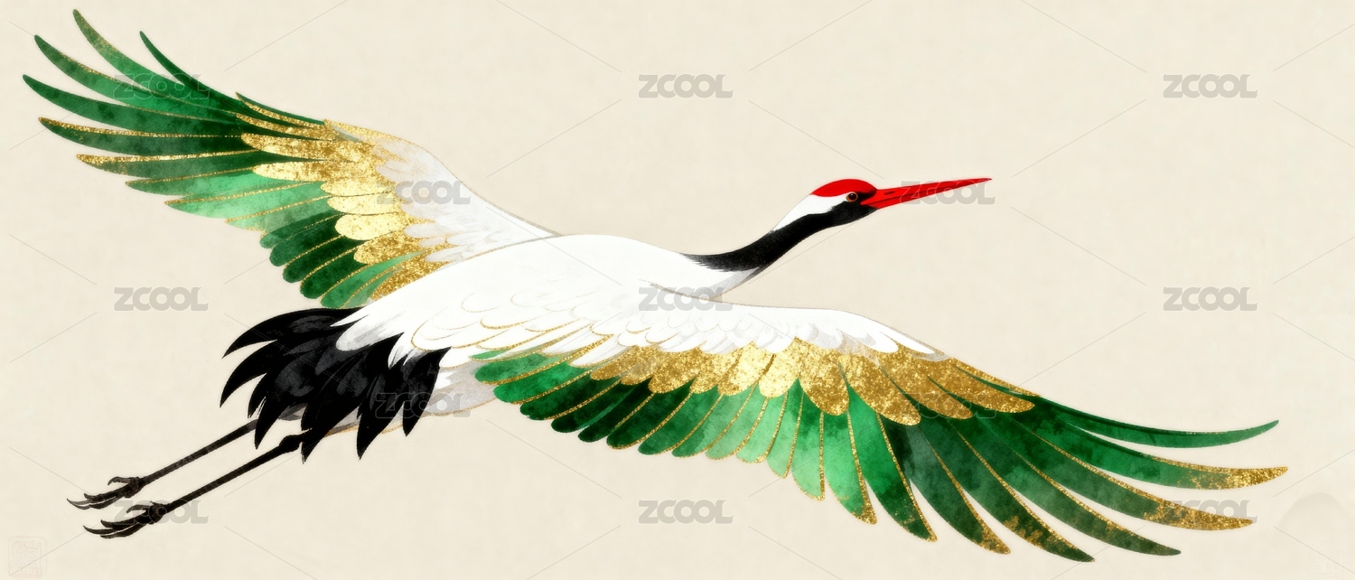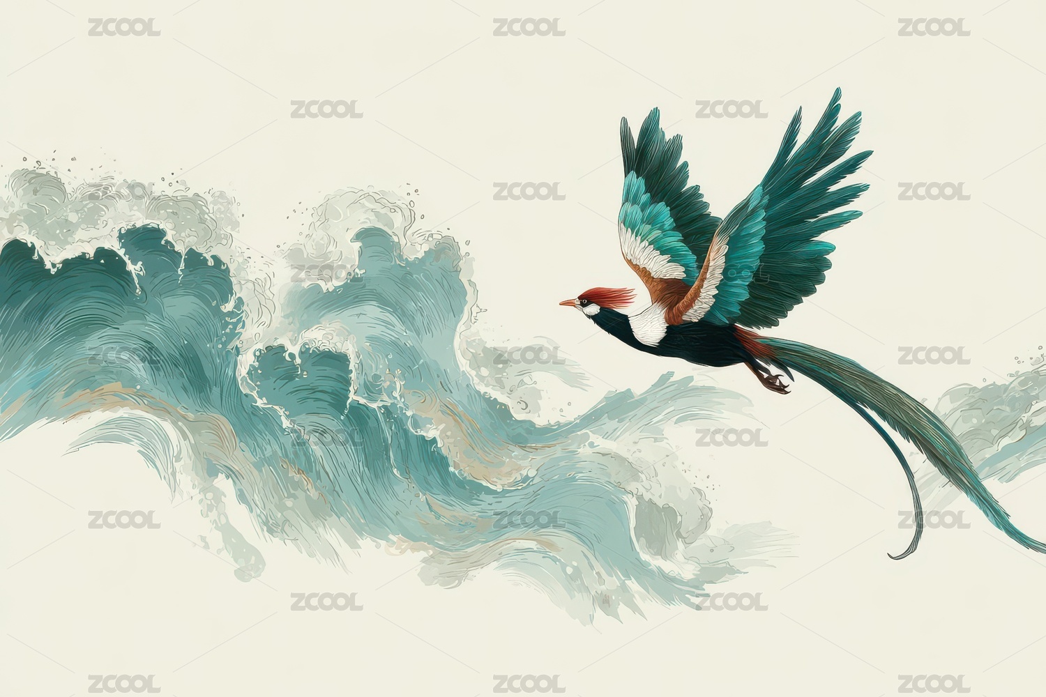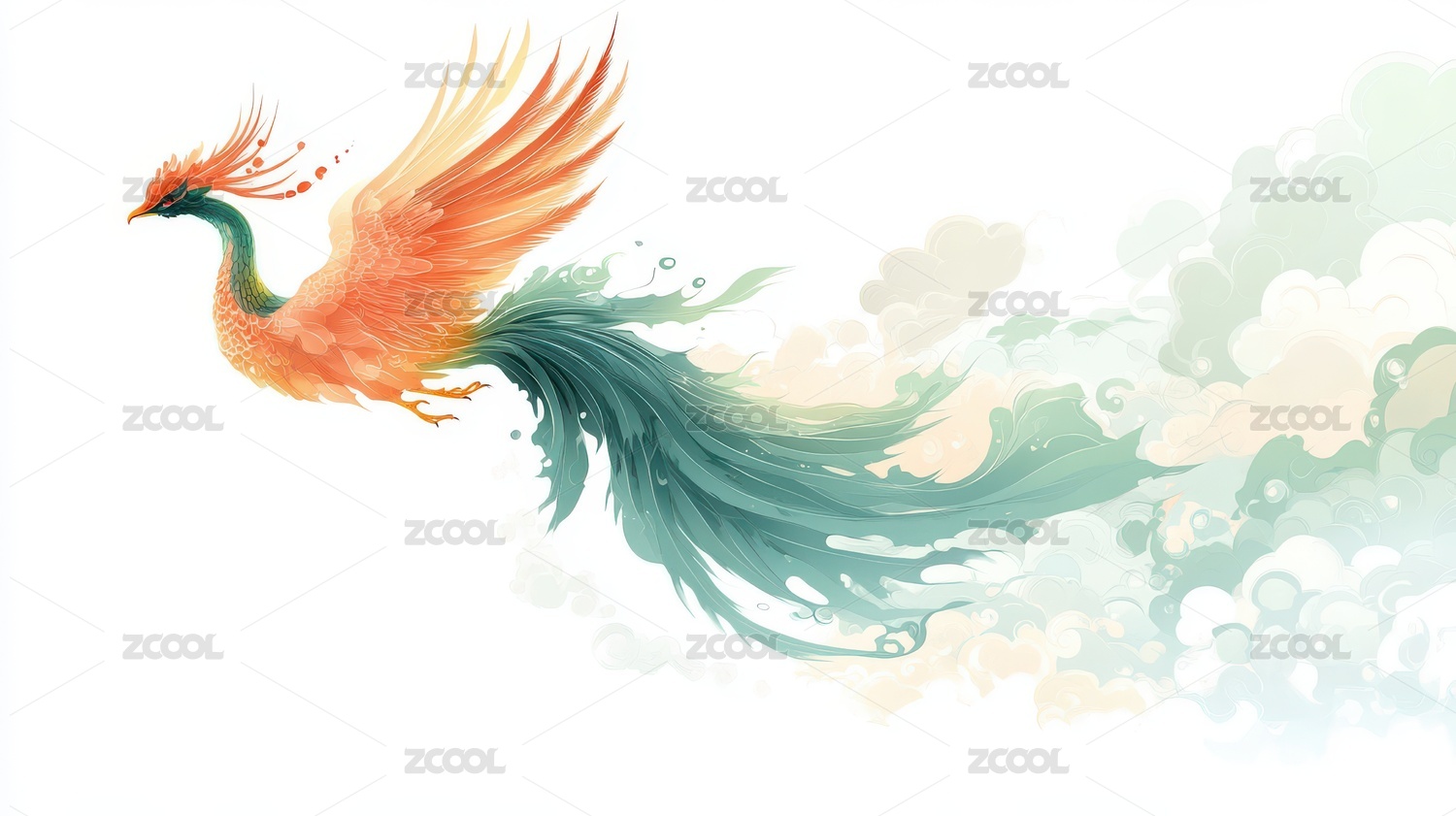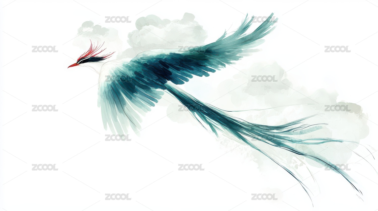 飞鸟,羽翼,长尾,青羽,展翅,云雾,动态,水彩,红冠,飘逸