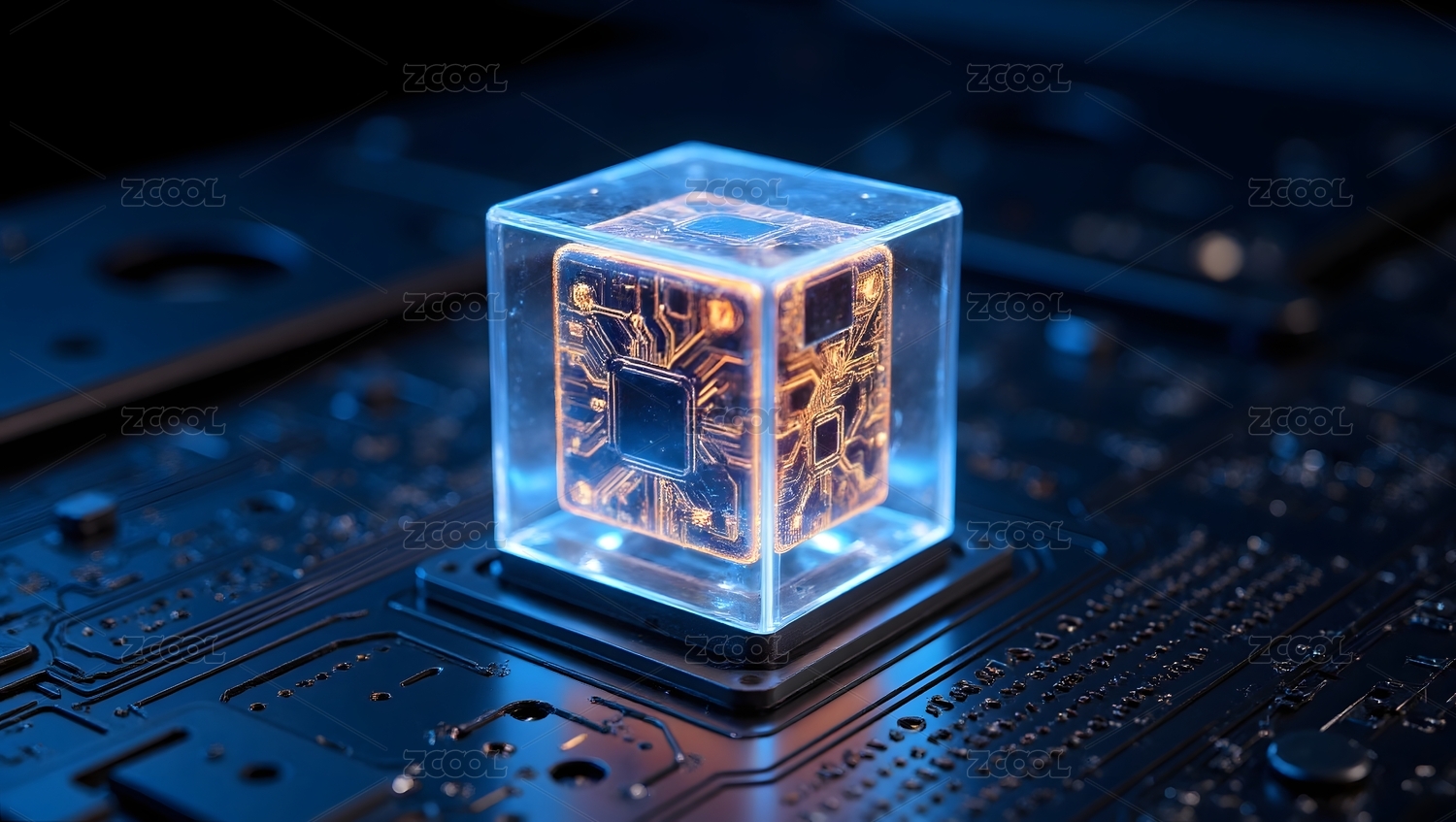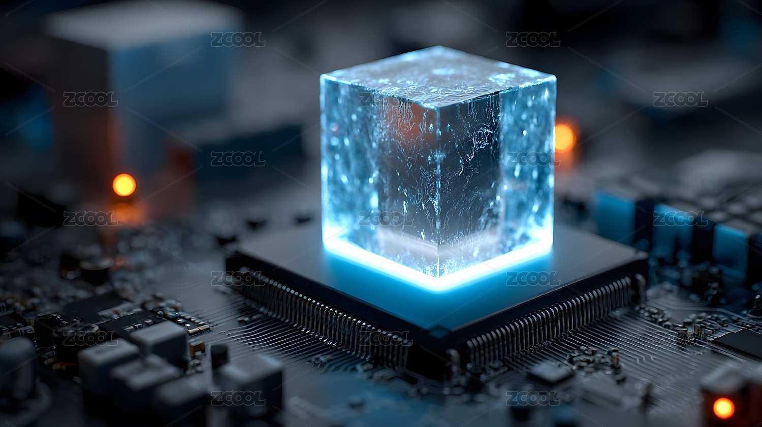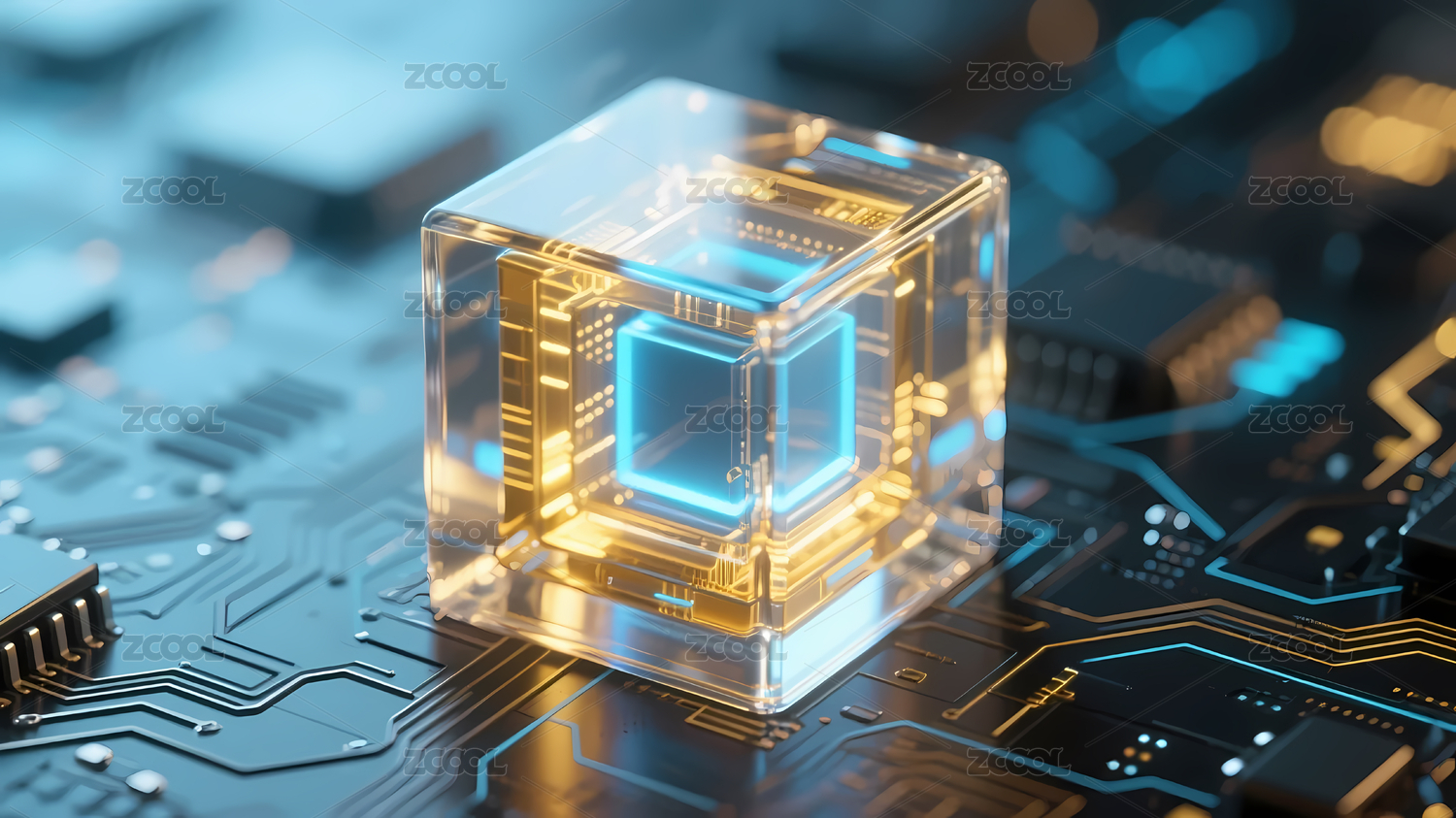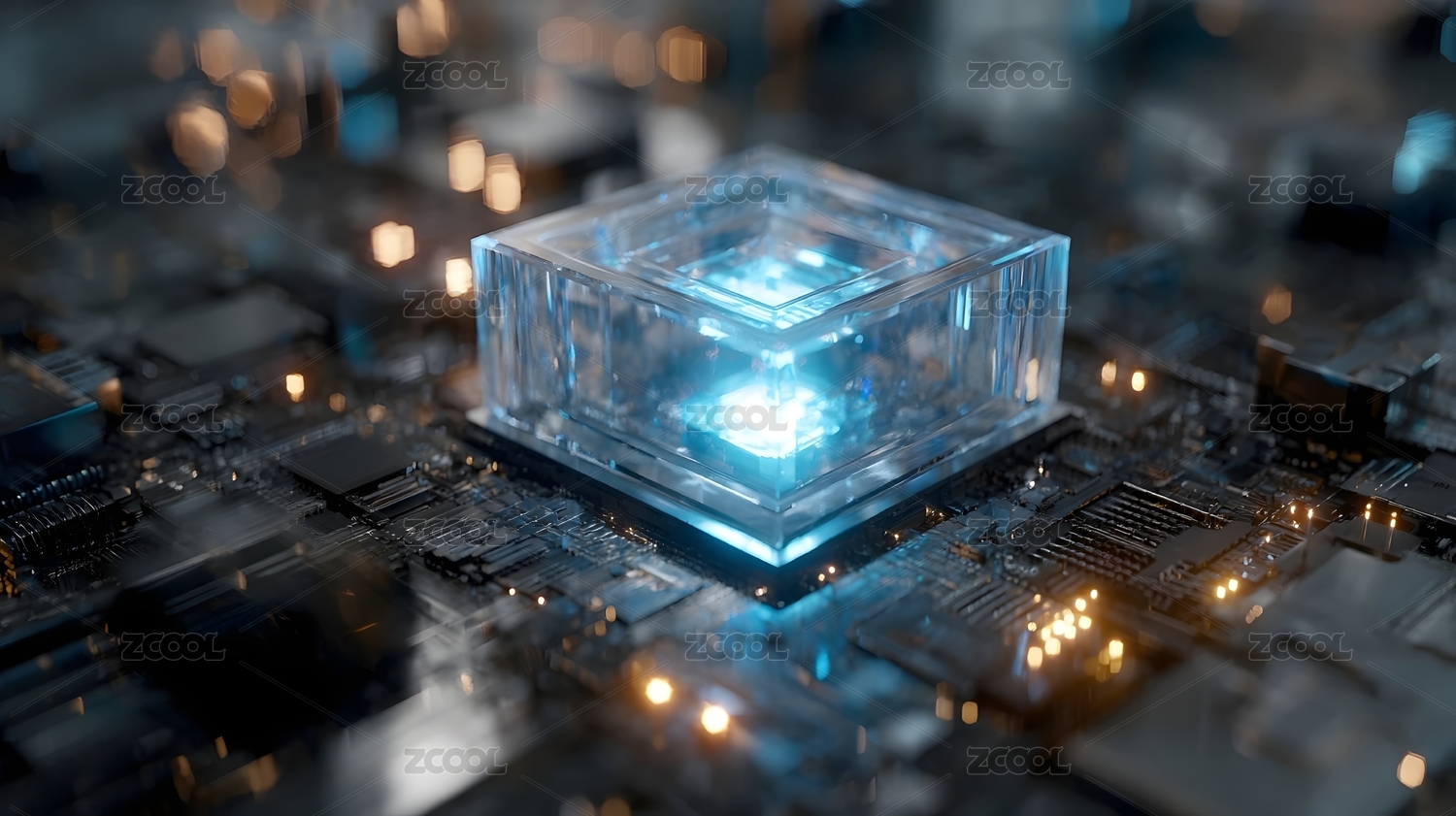 芯片,科技感,电路板,透明立方,发光元件,蓝色光效,金属基座,电子元件,精密结构,未来设计