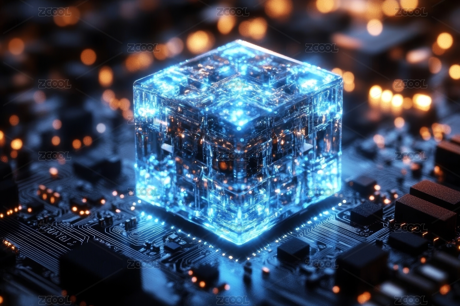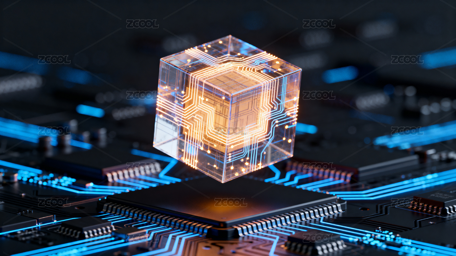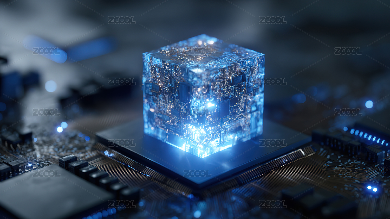 芯片,科技感,电路板,透明立方,发光元件,蓝色光效,金属基座,电子元件,精密结构,未来设计