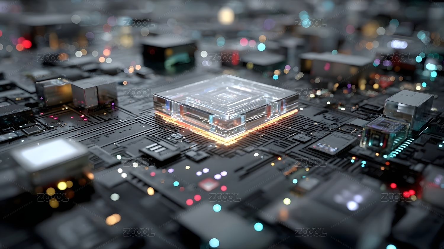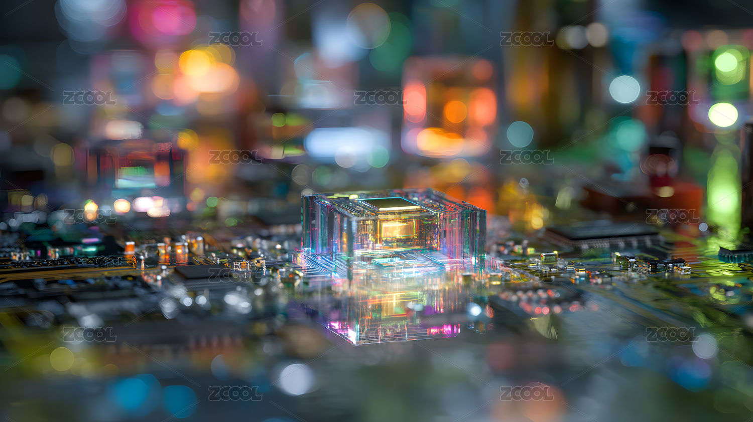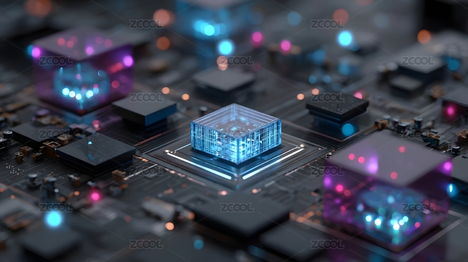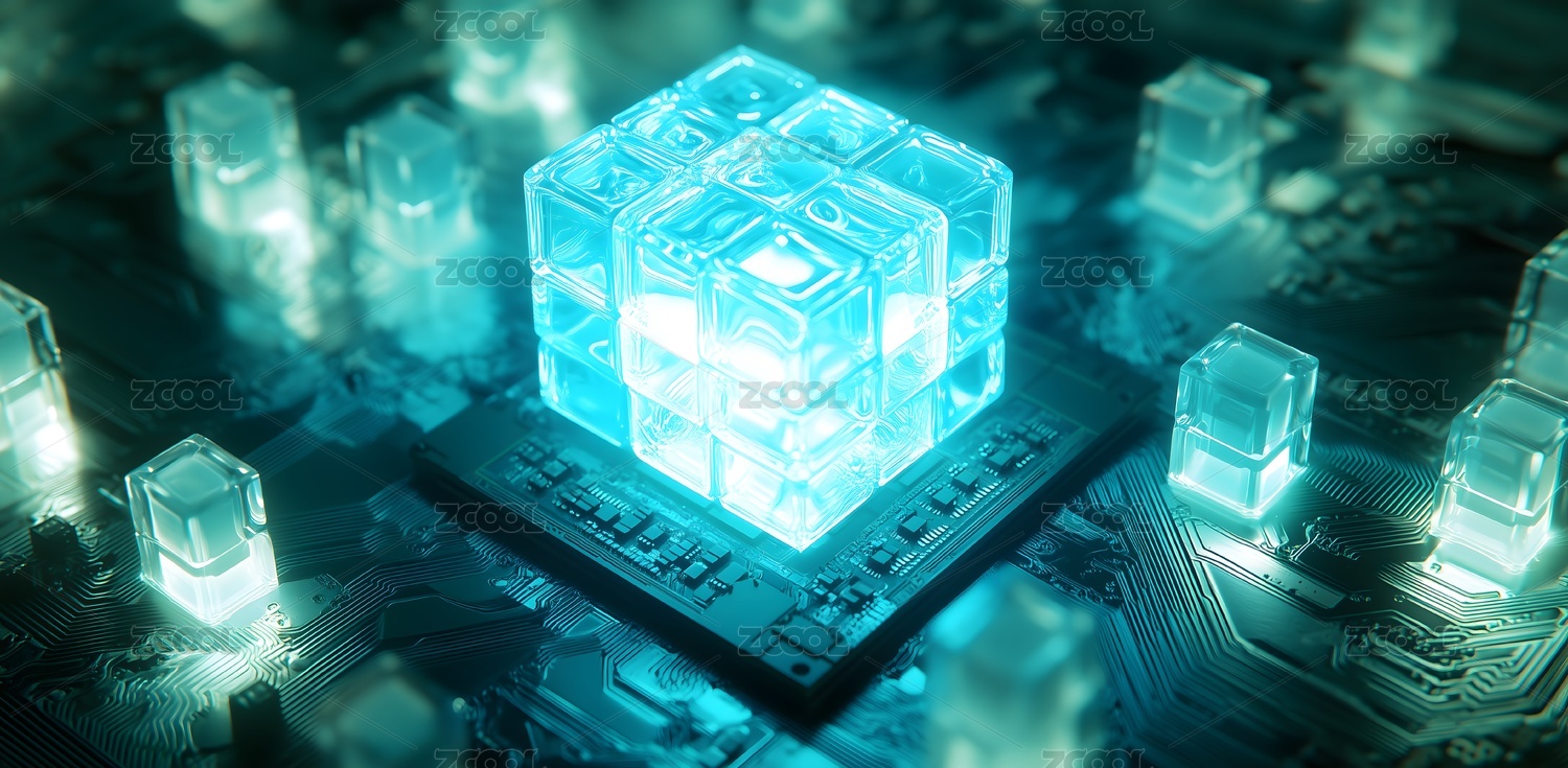 芯片,科技感,电路板,透明立方,发光元件,蓝色光效,金属基座,电子元件,精密结构,未来设计