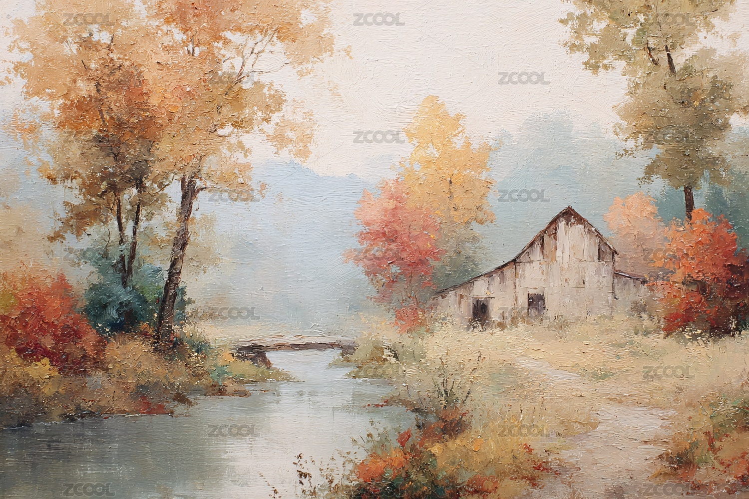秋日河畔小屋风景图