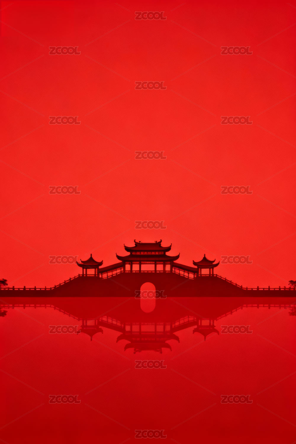 红色背景古建筑剪影