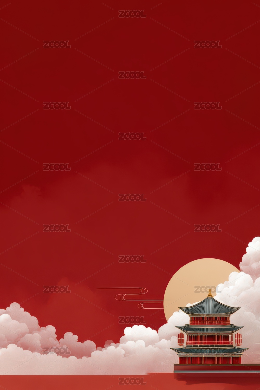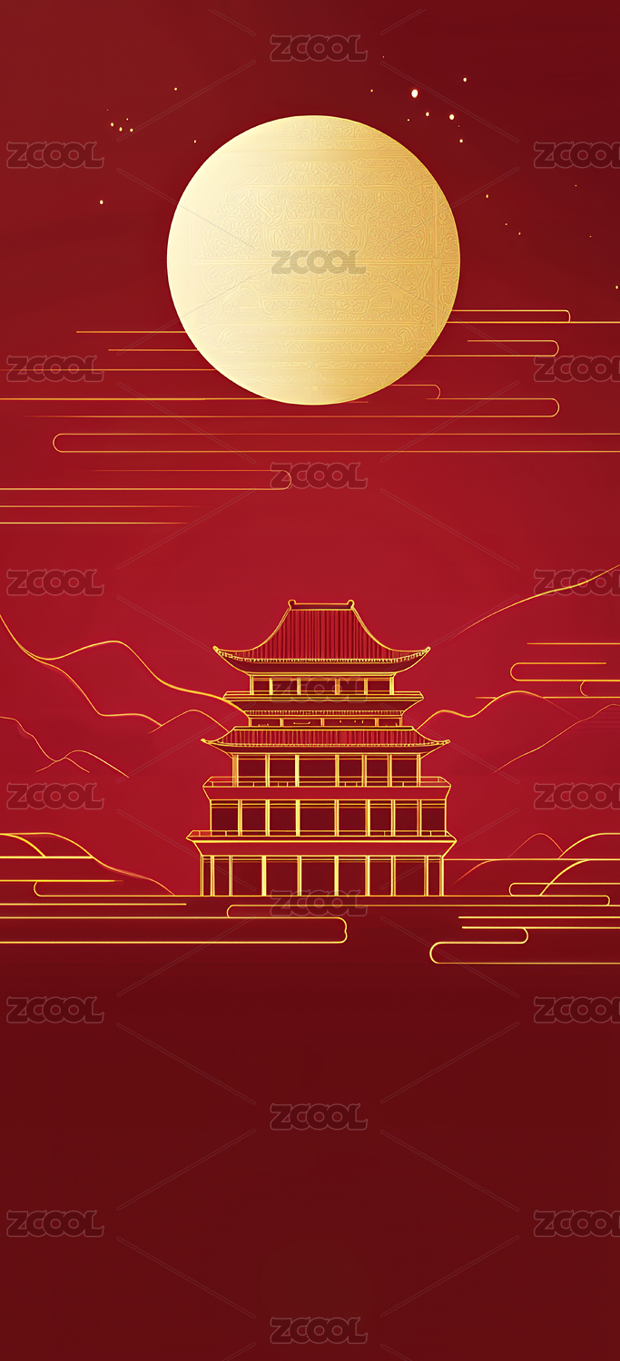 国潮,红金色,古建筑,背景,壁纸,商务,渐变,光影,艺术,古风