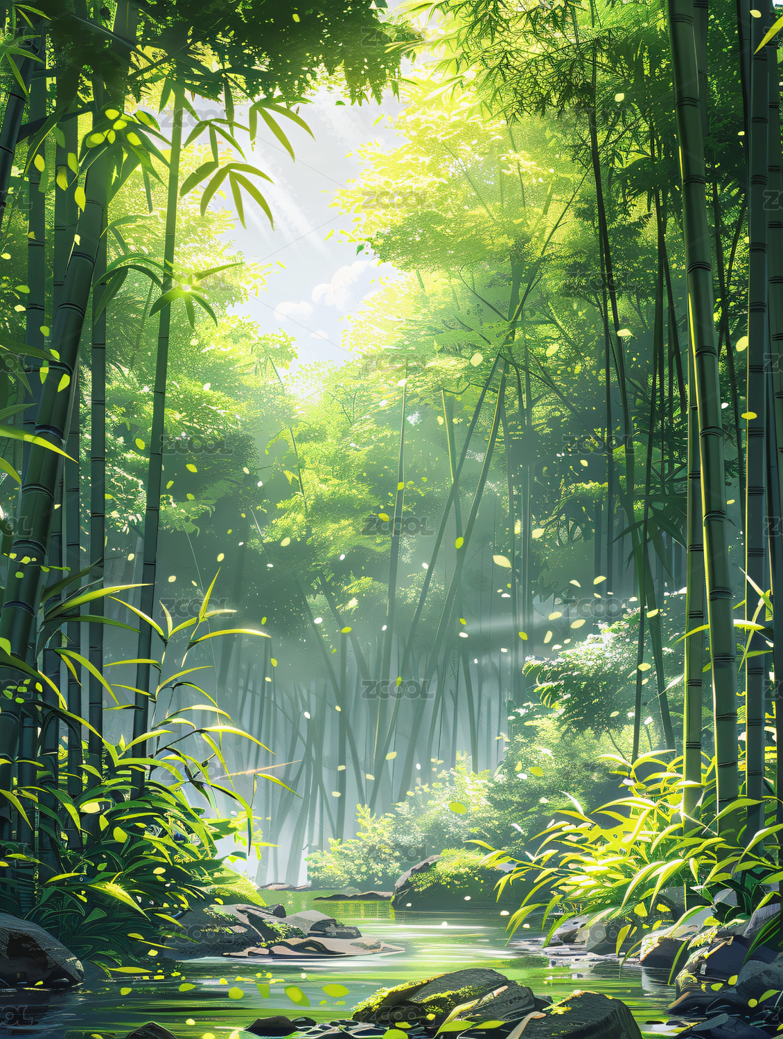 竹林幽泉的梦幻光影美景