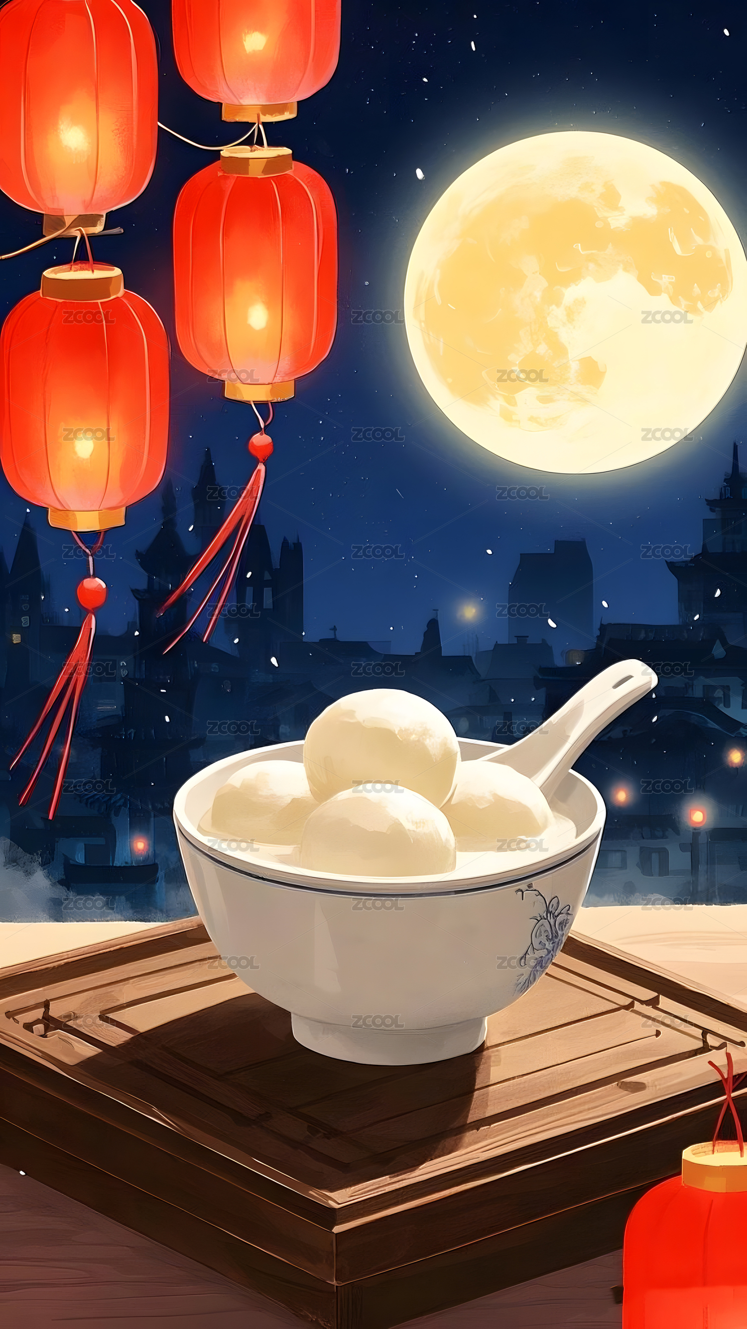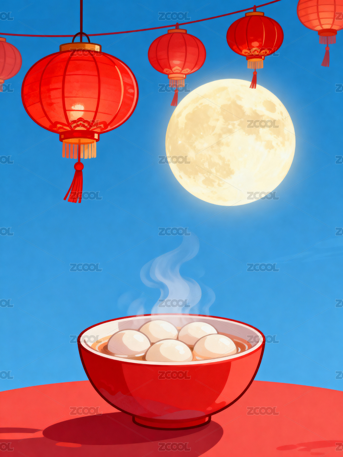 元宵佳节一碗汤圆和灯笼猜灯谜等国潮风插画