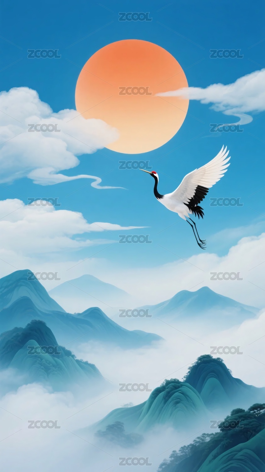 山水,丹顶鹤,夕阳,云雾,山水画,国画,水墨,自然,风景,山峦