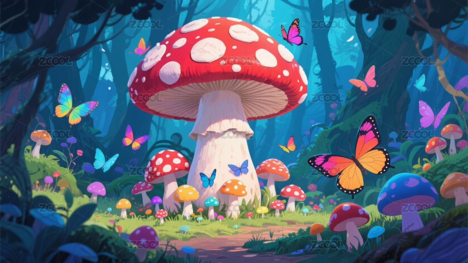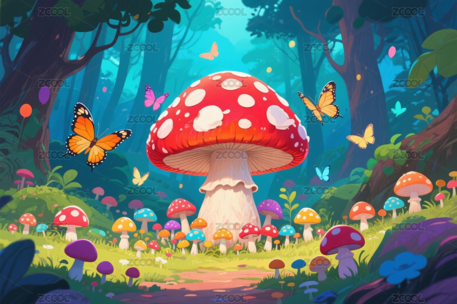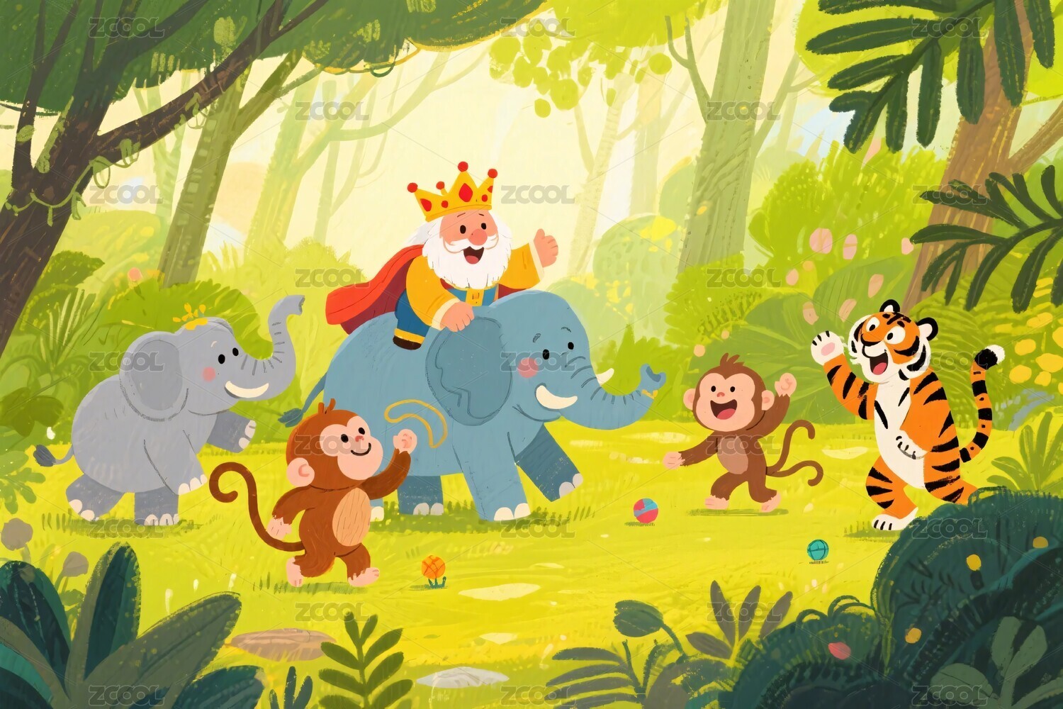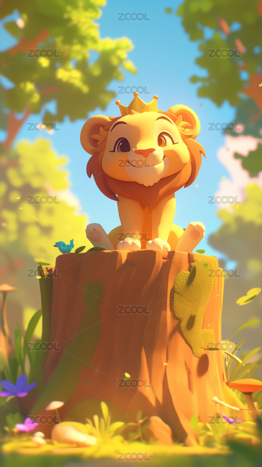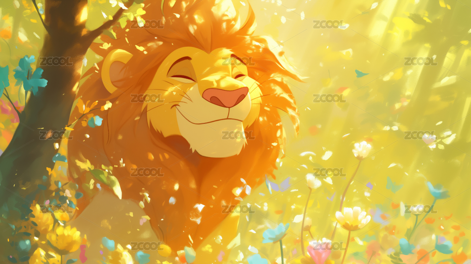 自然,阳光,绿色,梦幻,花朵,树木,可爱,卡通,狮子,狐狸