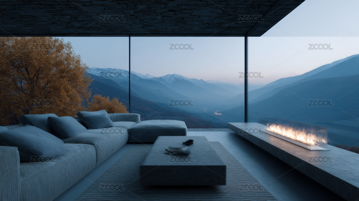 客厅,落地窗,秋日,森林,阳光,沙发,茶几,绿植,壁炉,温馨