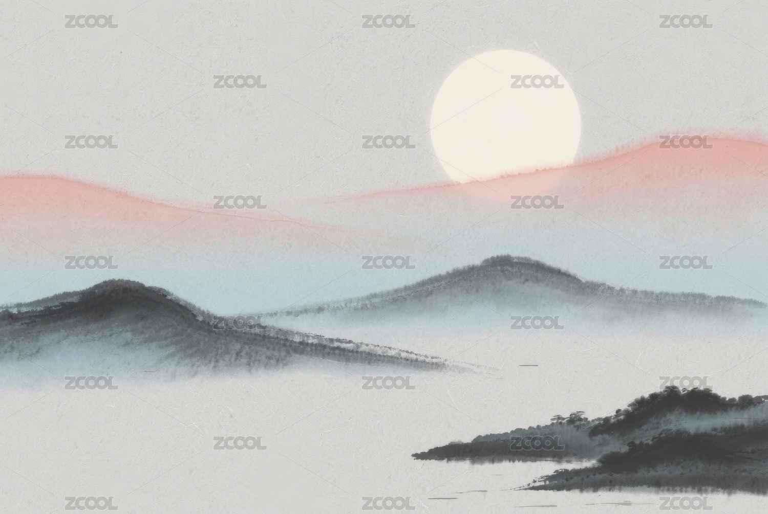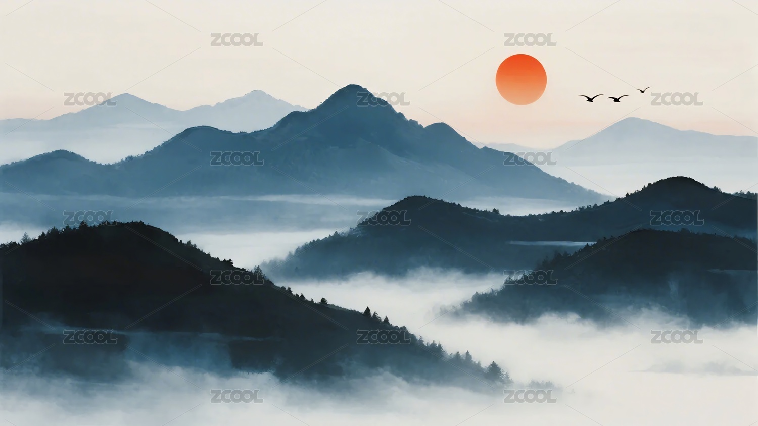 山水,水墨,云雾,夕阳,山水画,国画,插画,传统艺术,风景,山水水墨