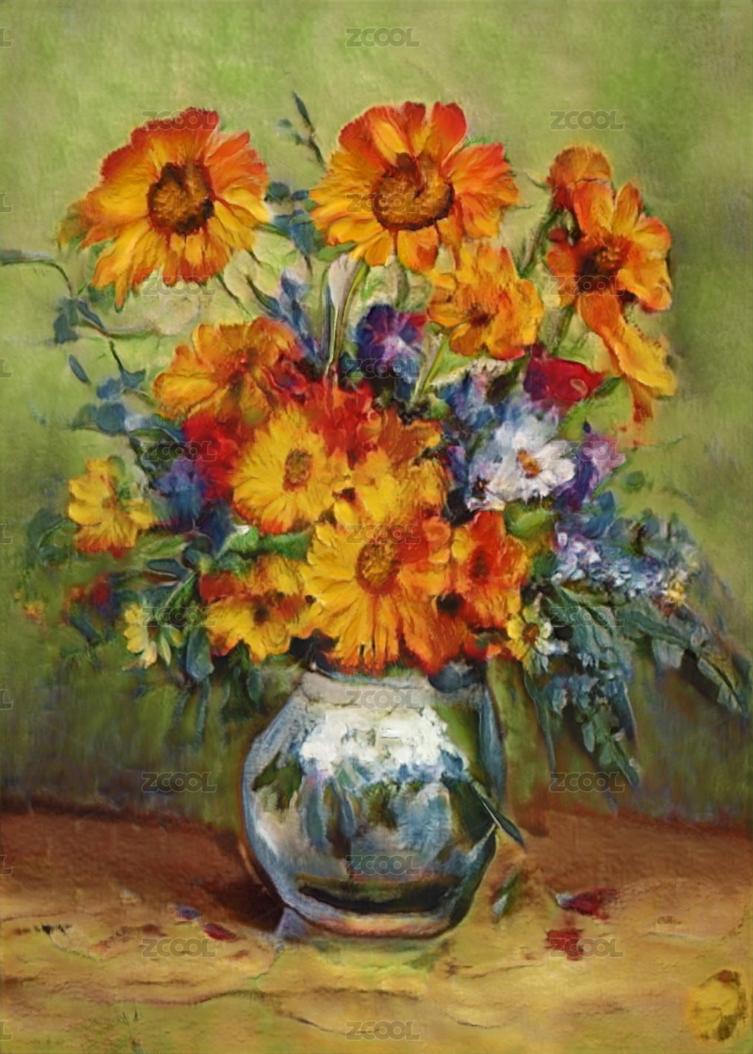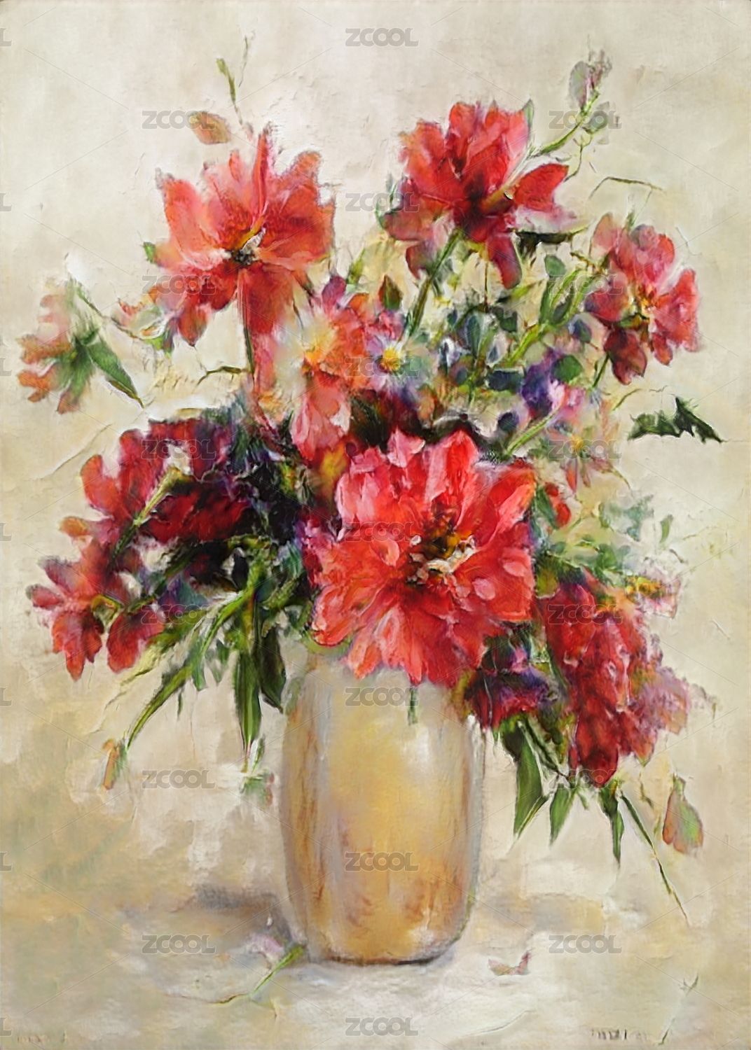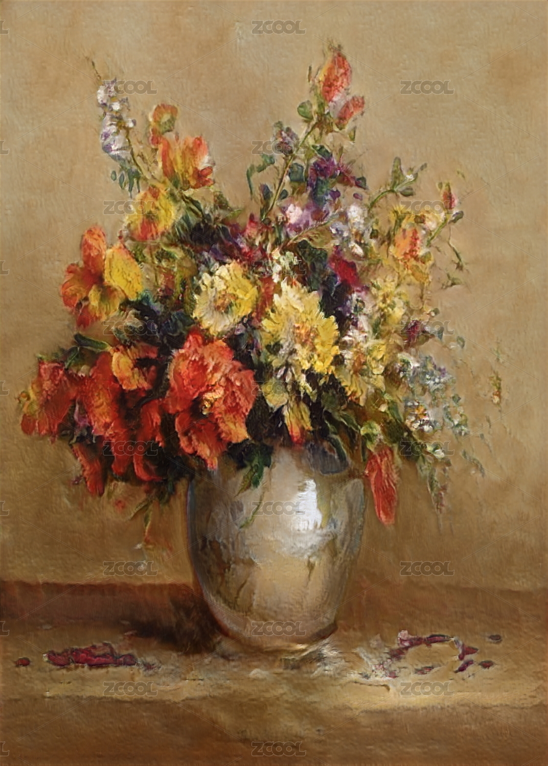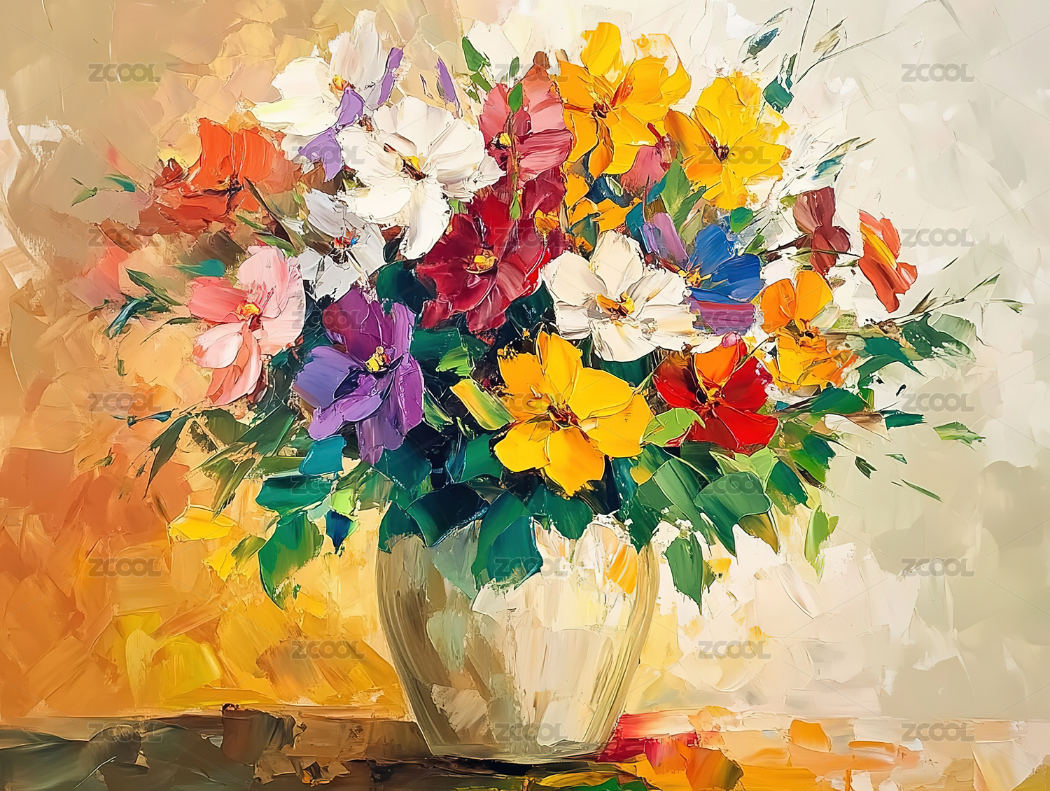 厚涂粗笔触印象派桌上的粉色插花背景海报