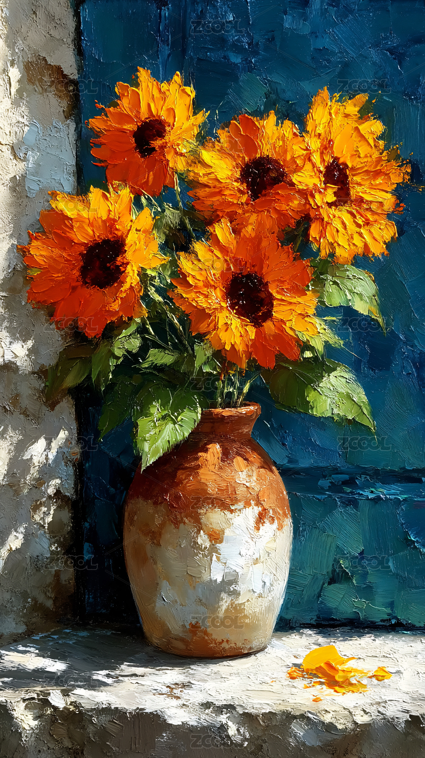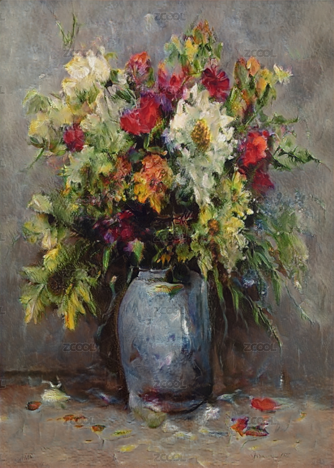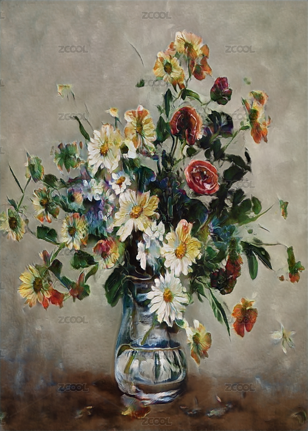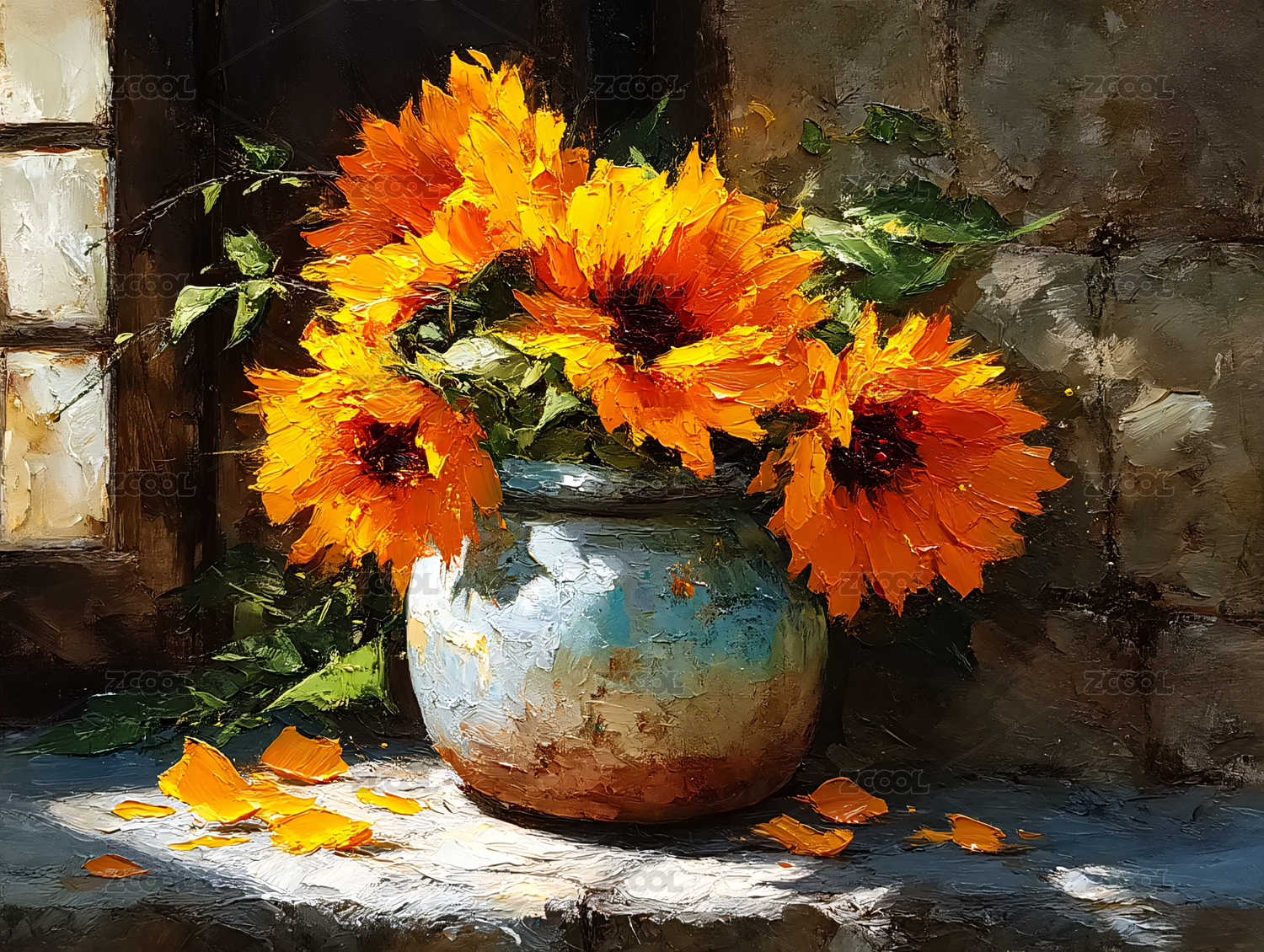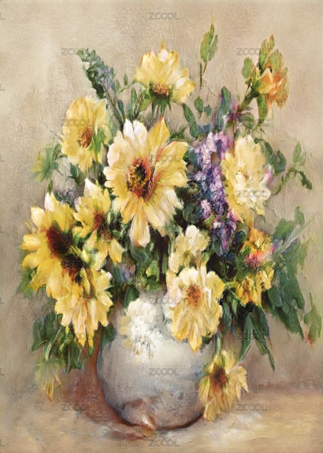厚涂粗笔触印象派桌上的粉色插花背景海报