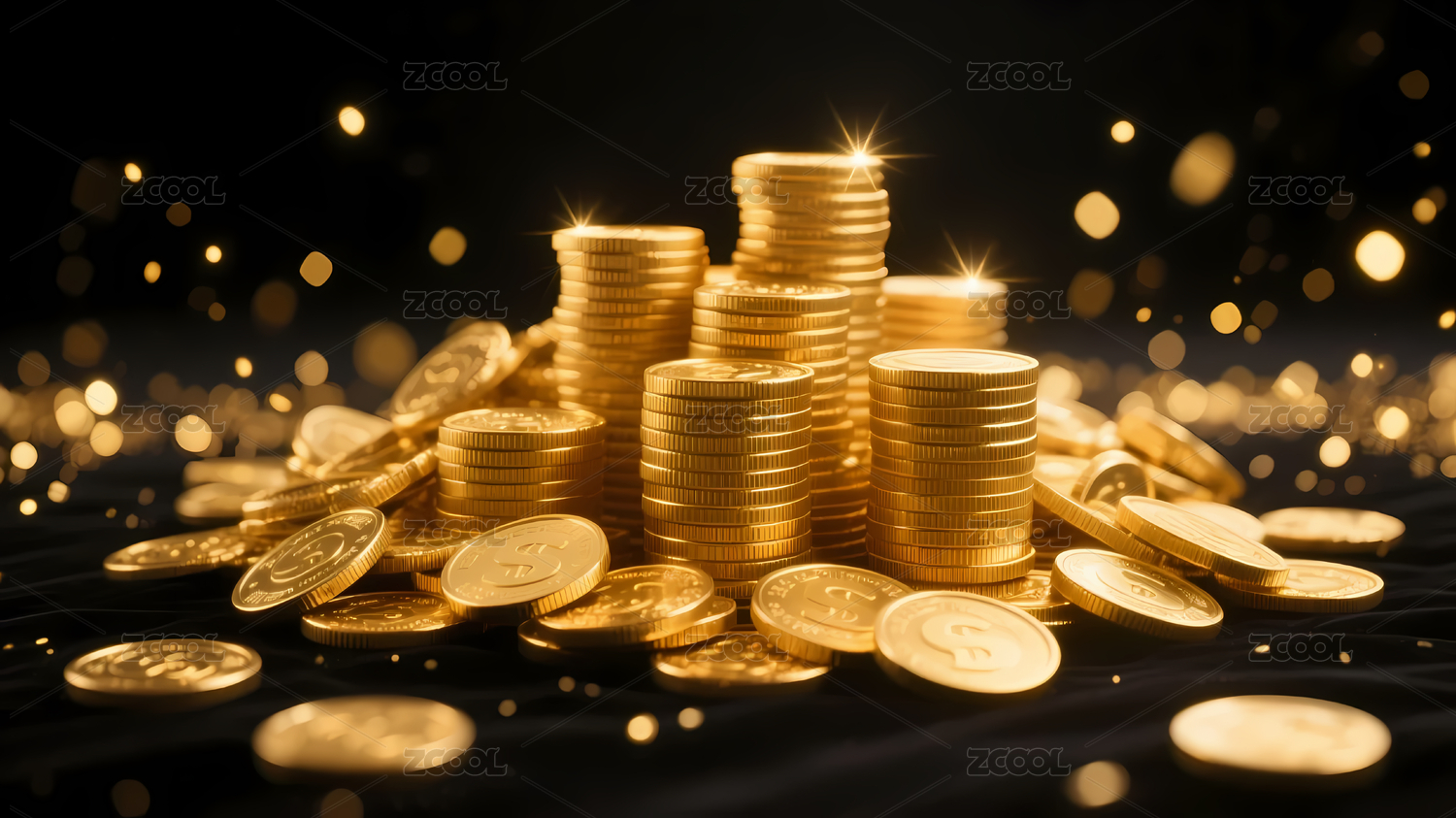 星光下的金黄硬币闪耀财富光芒