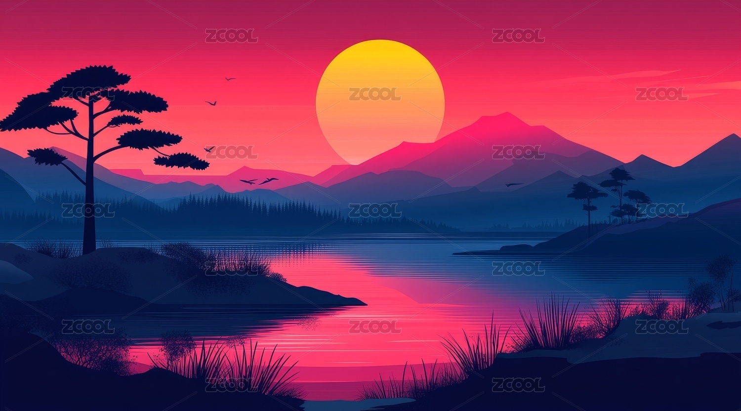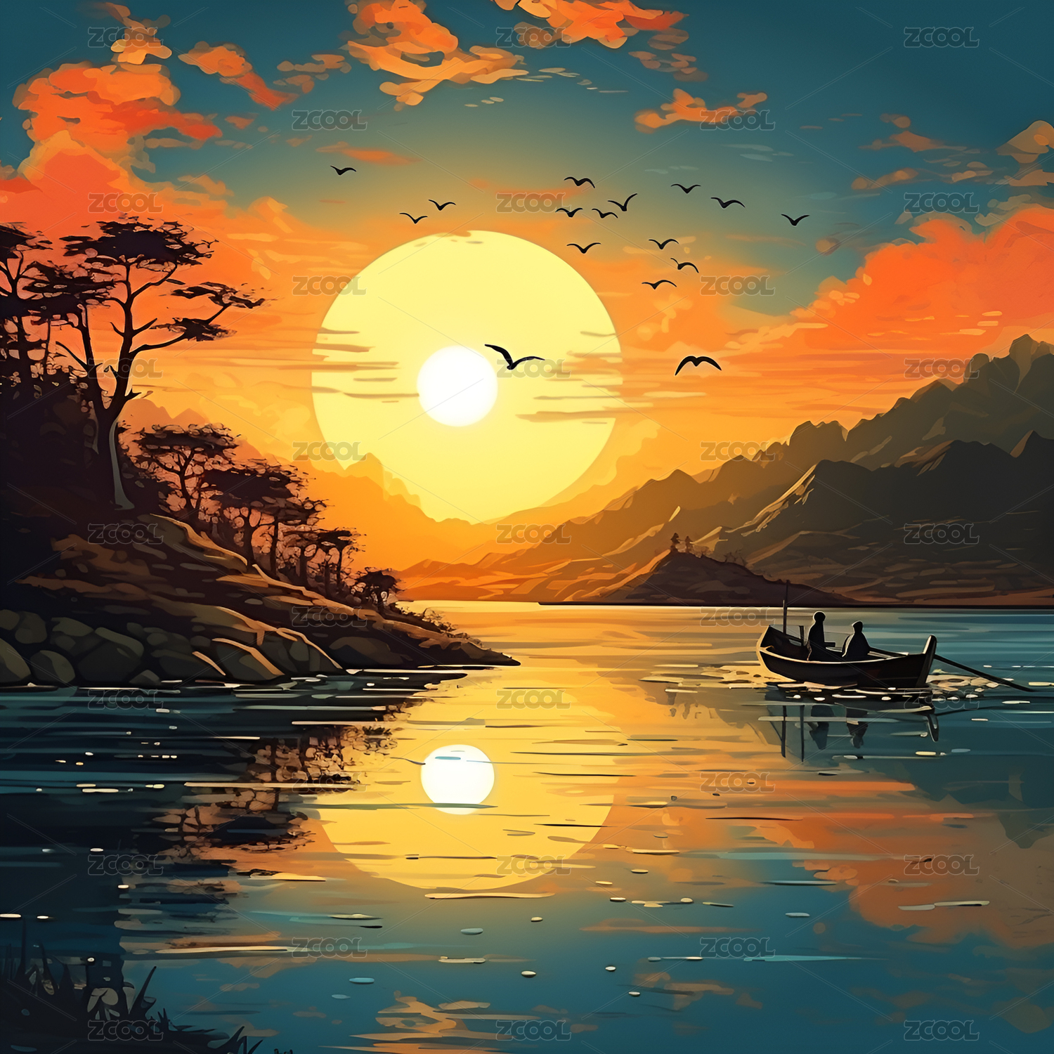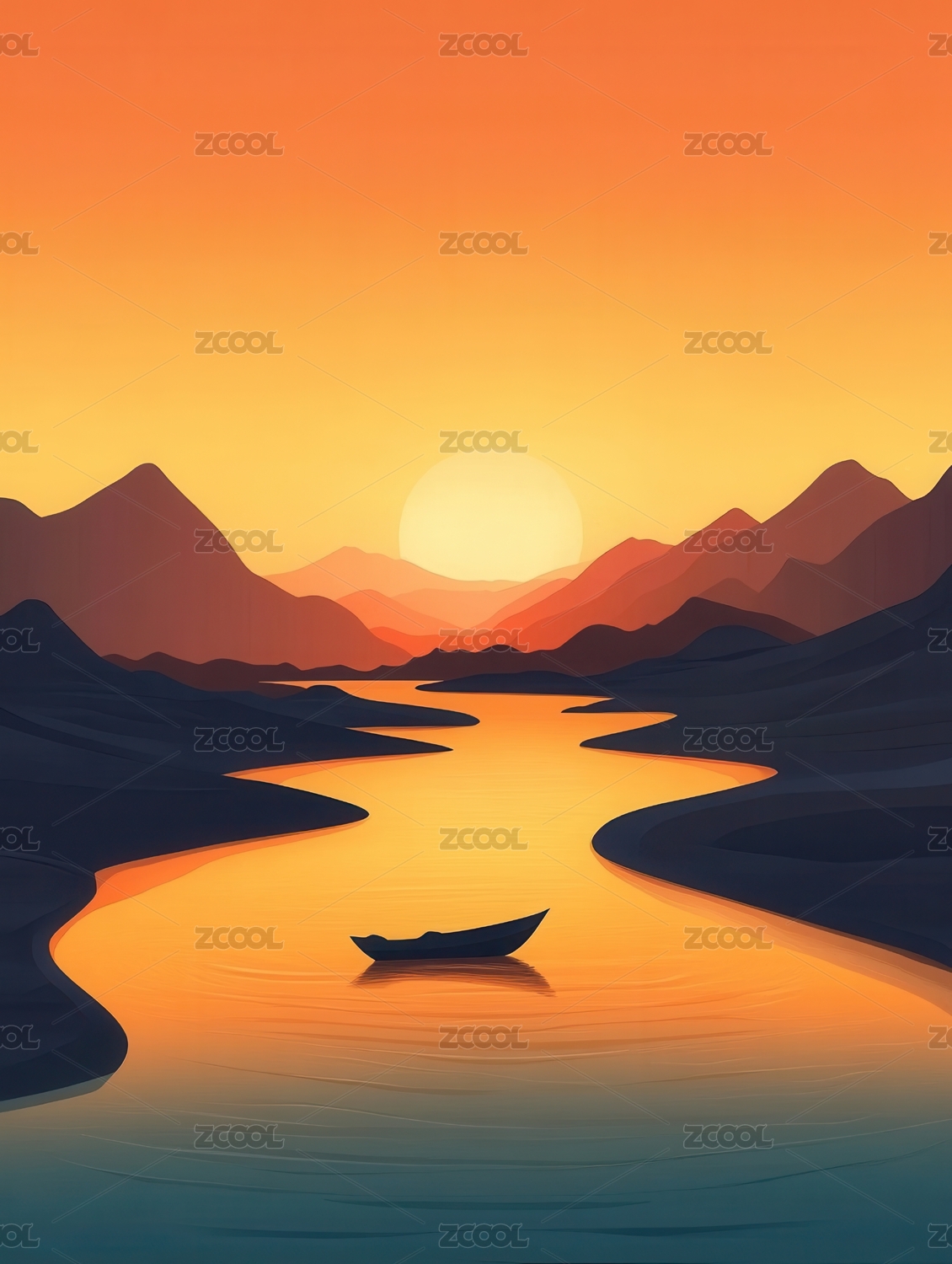 山水,夕阳,小船,湖泊,风景,插画,风景画,山水画,自然,日落
