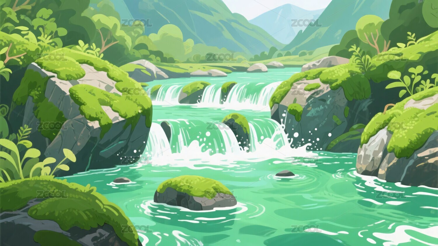 清新插画风格的山间溪流景观