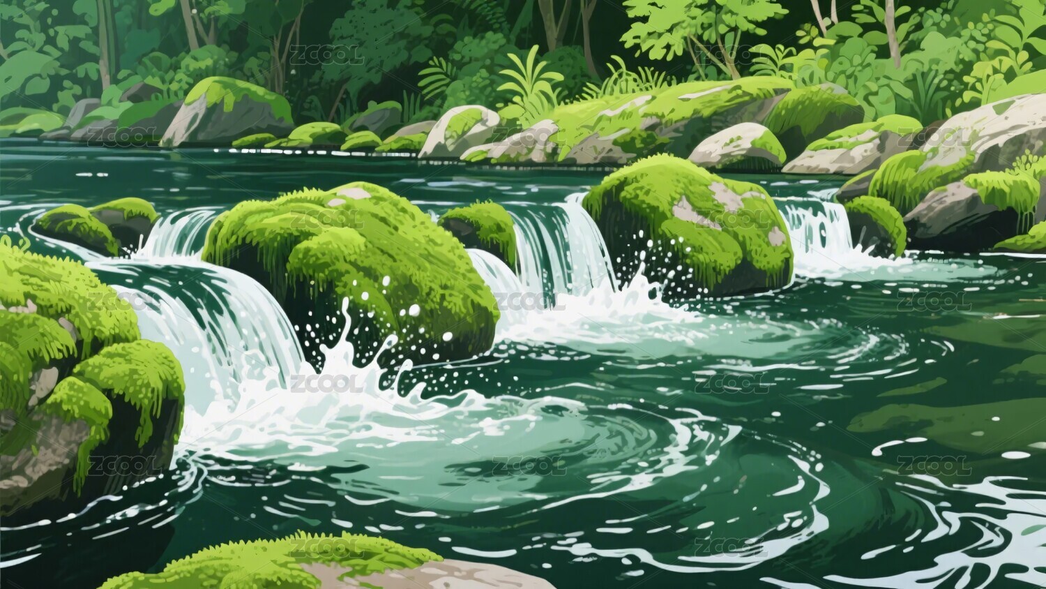 插画风格的湍急溪流景观