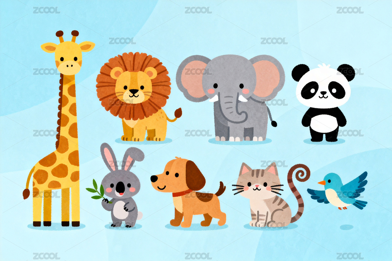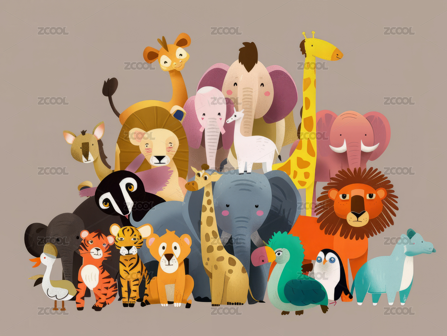 老虎,鹿,鸟,长颈鹿,狼,野猪,奶牛,骆驼,斑马,大象