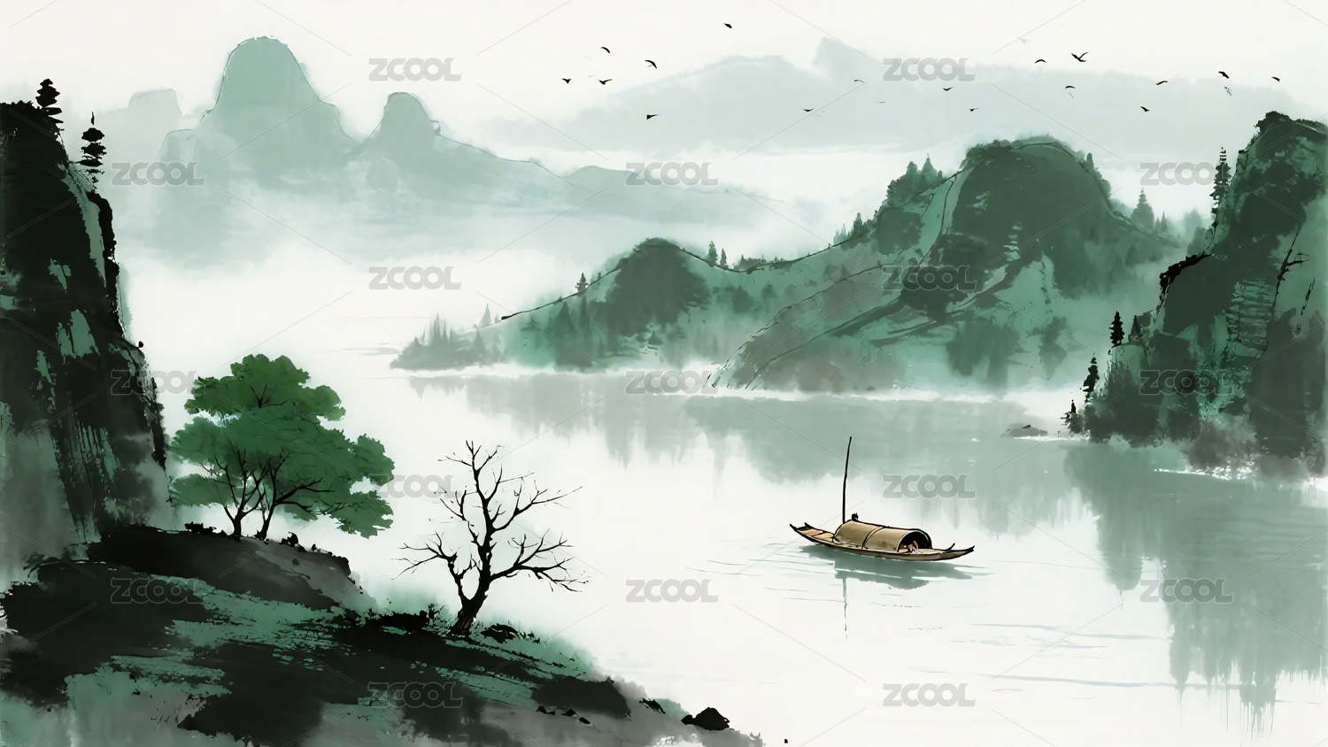 艺术,墨色,绘画,传统,静谧,天空,树木,宁静,自然,绿色