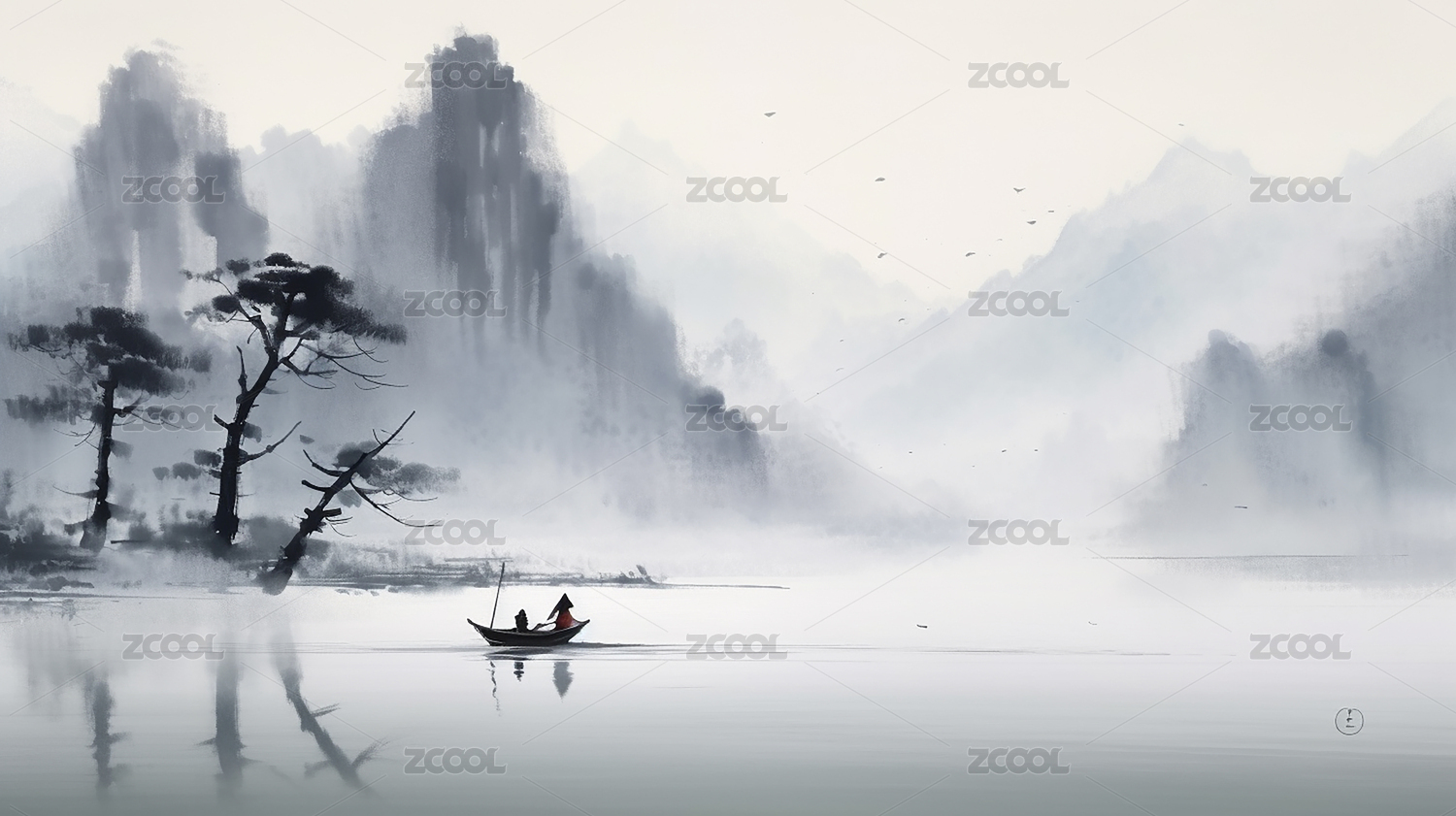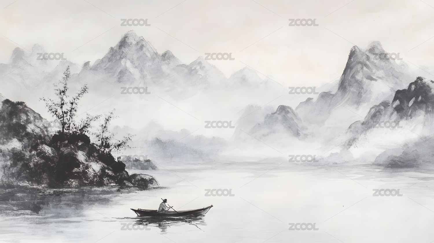 水墨画风格山水渔夫图