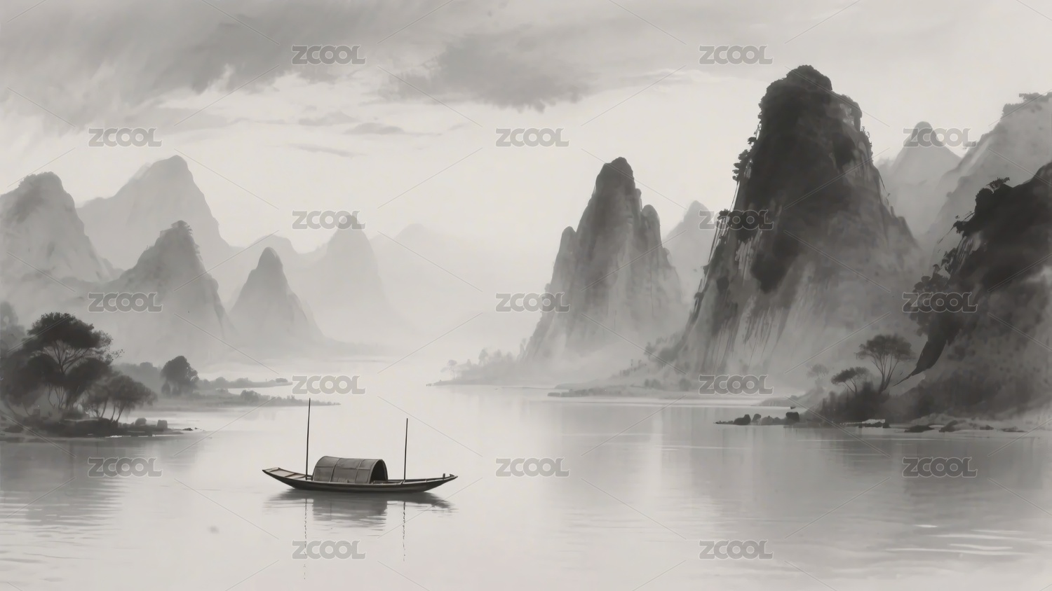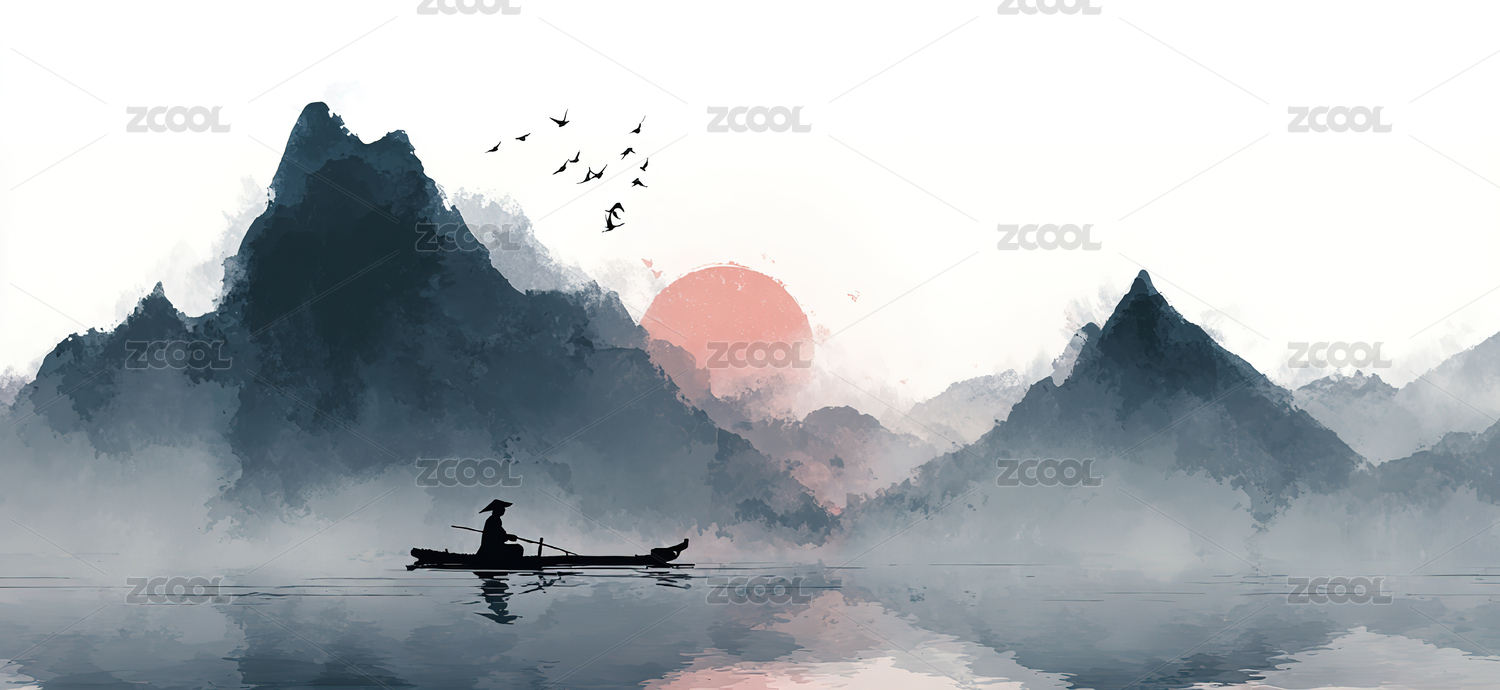 水墨山水间的孤舟景色