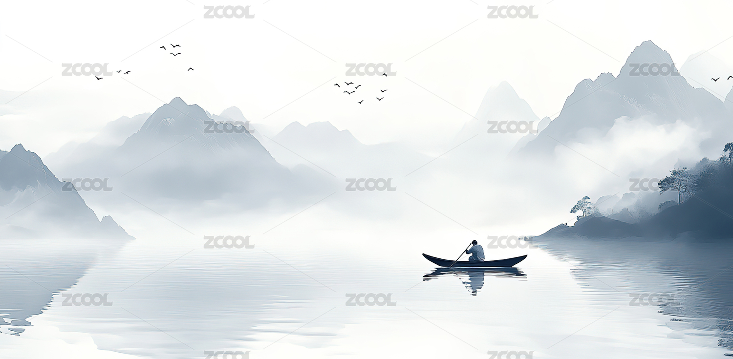 水墨山水间的孤舟旅人